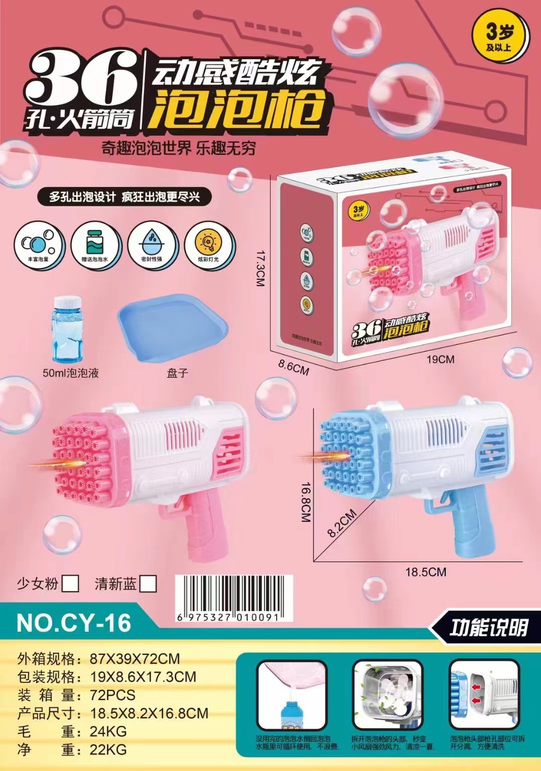 注意:10孔天使泡泡枪,40孔火箭筒,40孔恐龙枪,45孔火箭筒,45孔泡泡枪,这几款包装为英文包装,仅供跨境外销,国内小时注意慎拍。