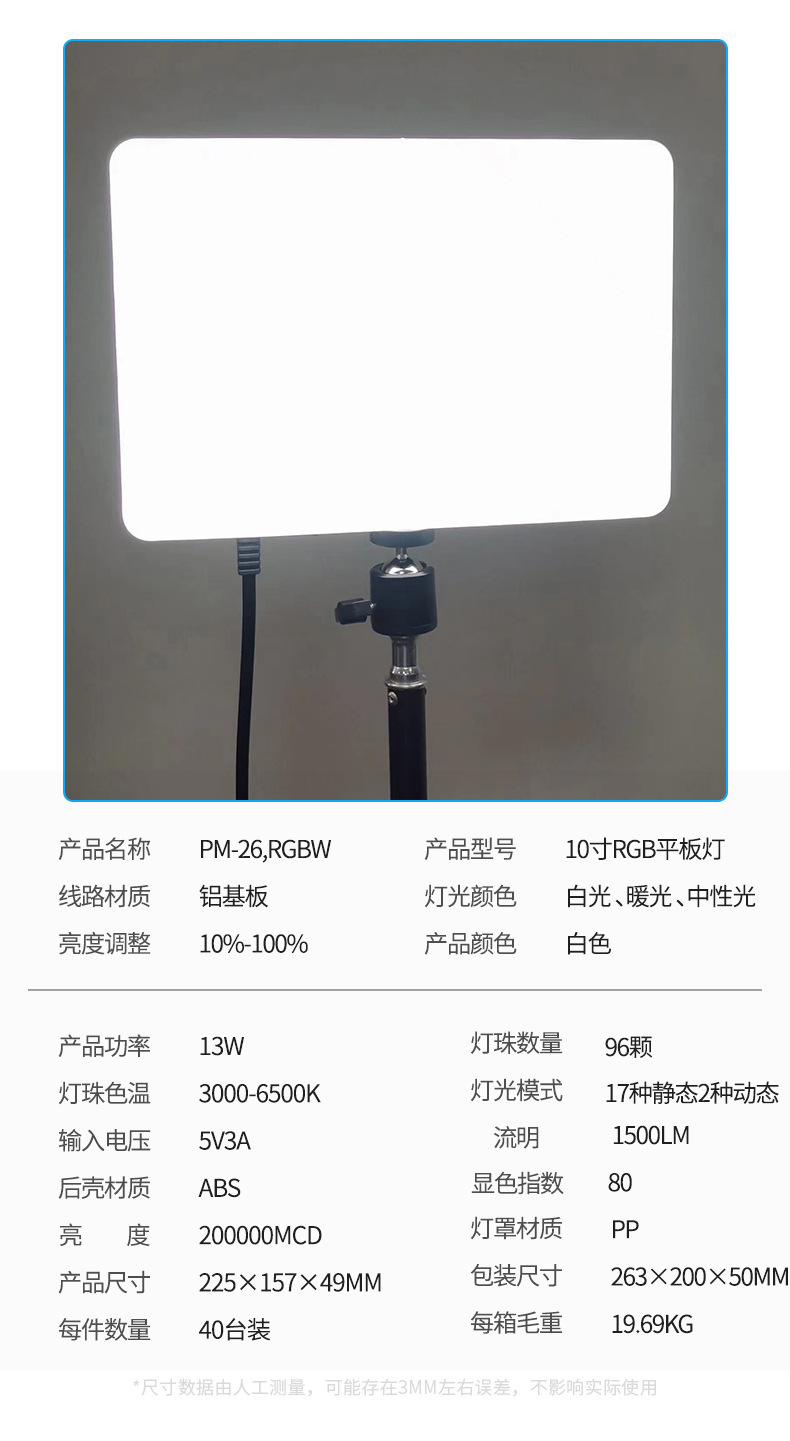 10 인치 RGB 평면 조명 필 라이트 라이브 라이트 사진 셀카 LED 조명 소프트 라이트 전체 화면 사각형 조명
