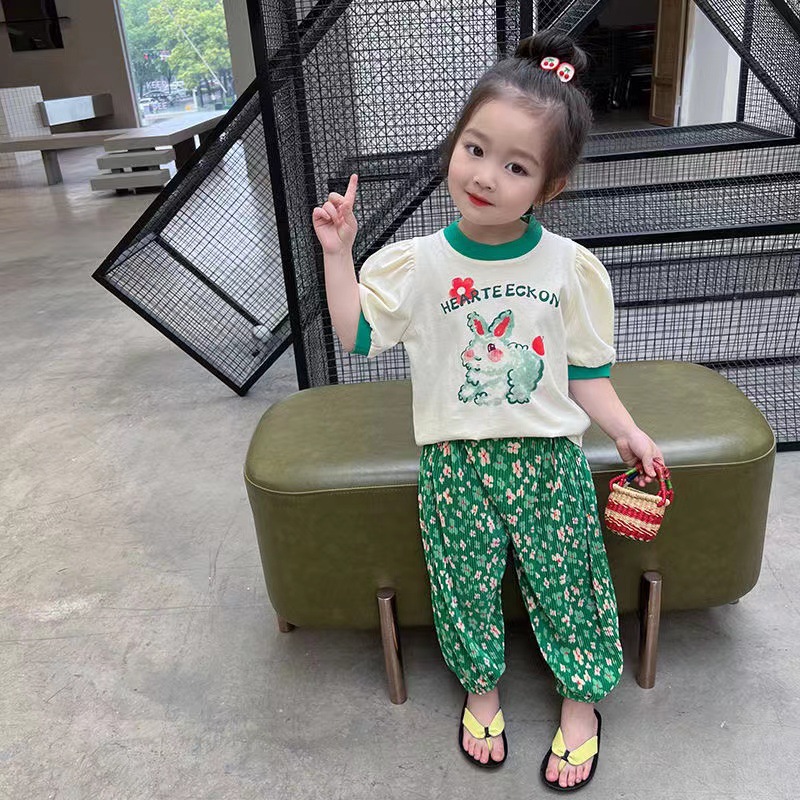 여아 세트 웨스턴 스타일 2023 여름 새로운 유행 아동 반팔 티셔츠 투피스 세트 여아 모기 방지 바지 여름 착용