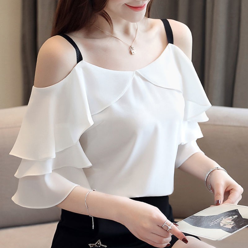 프릴 칼라 셔츠 쉬폰 셔츠 여성용 여름 새로운 우아한 작은 셔츠 화이트 반팔 러플 올매치 캐미솔 탑스토어 가기