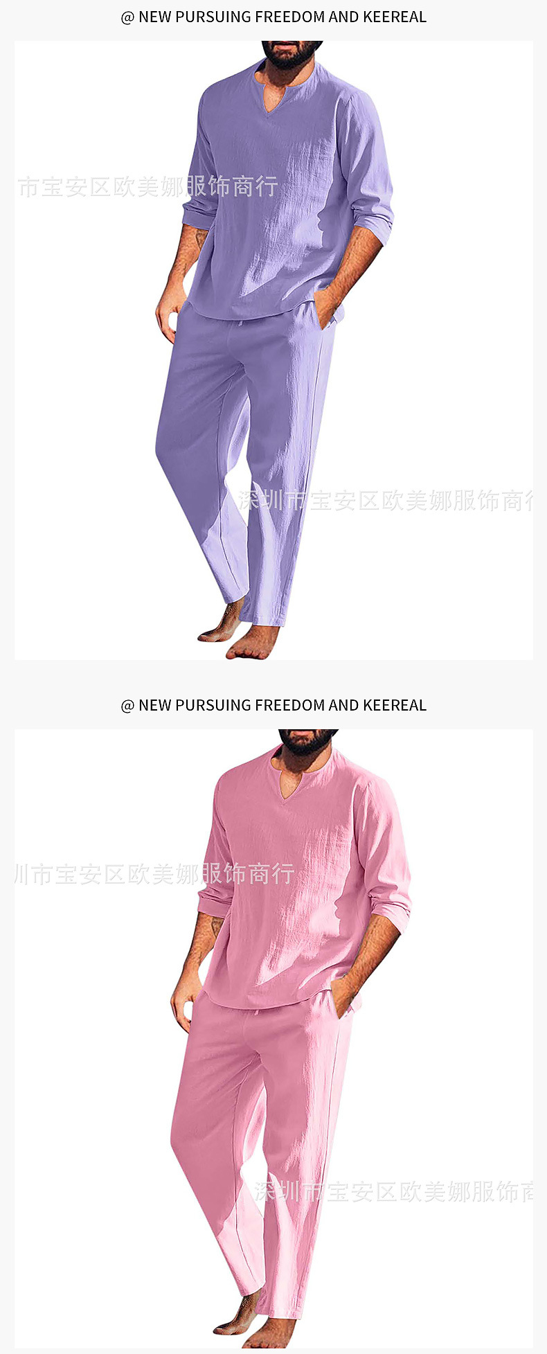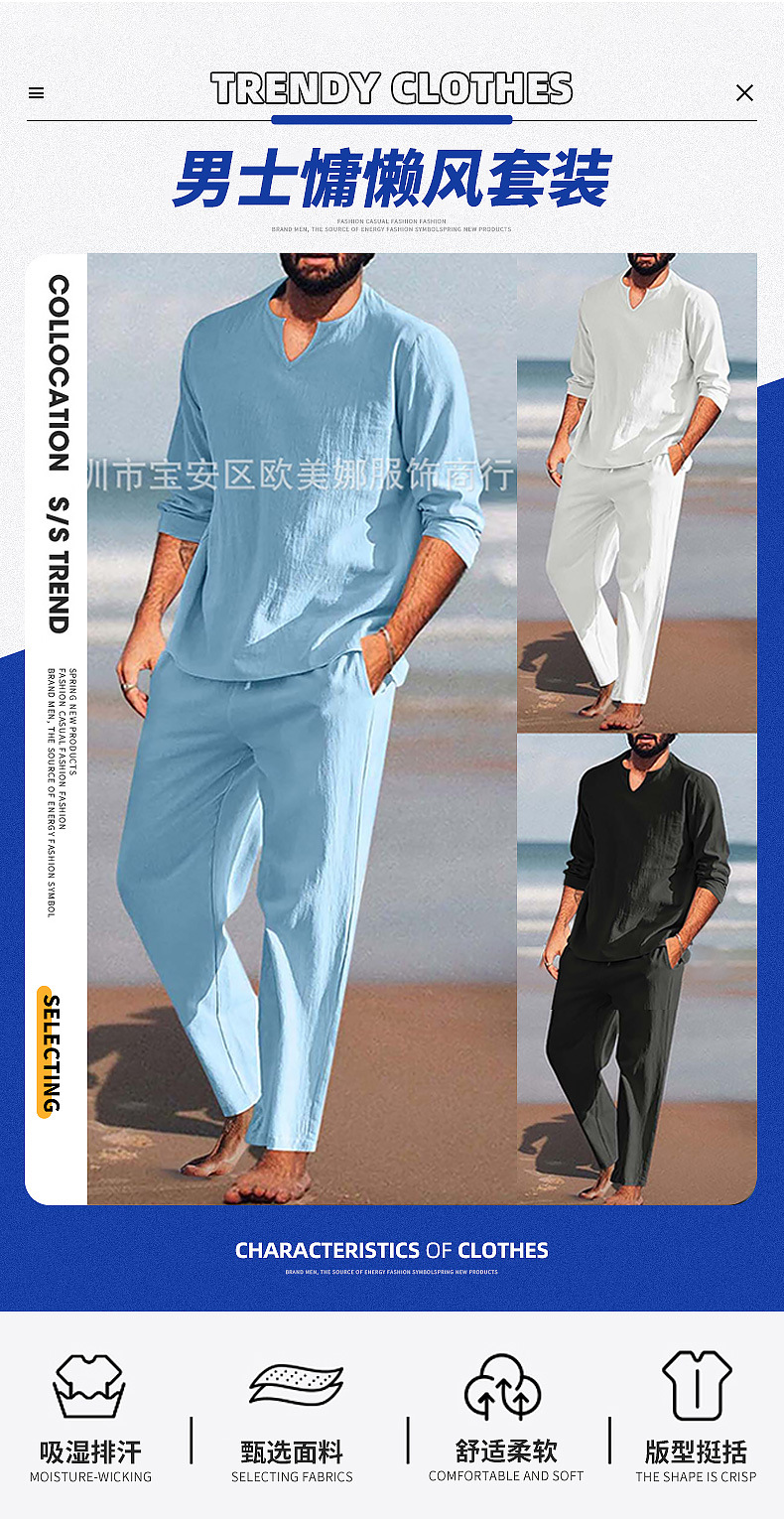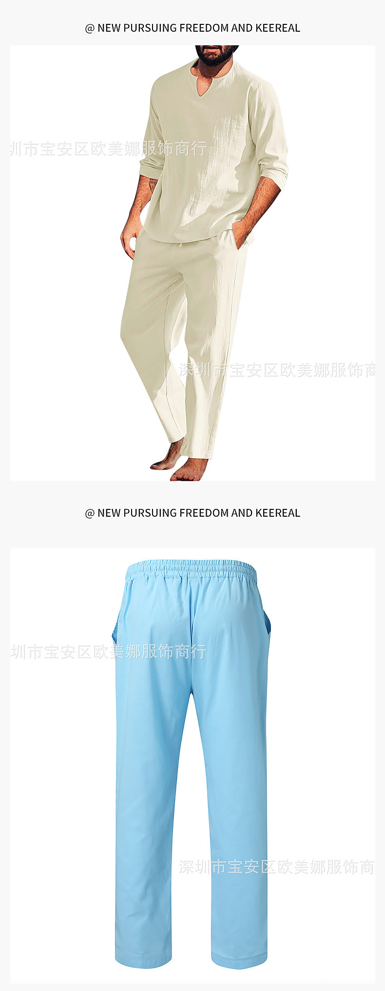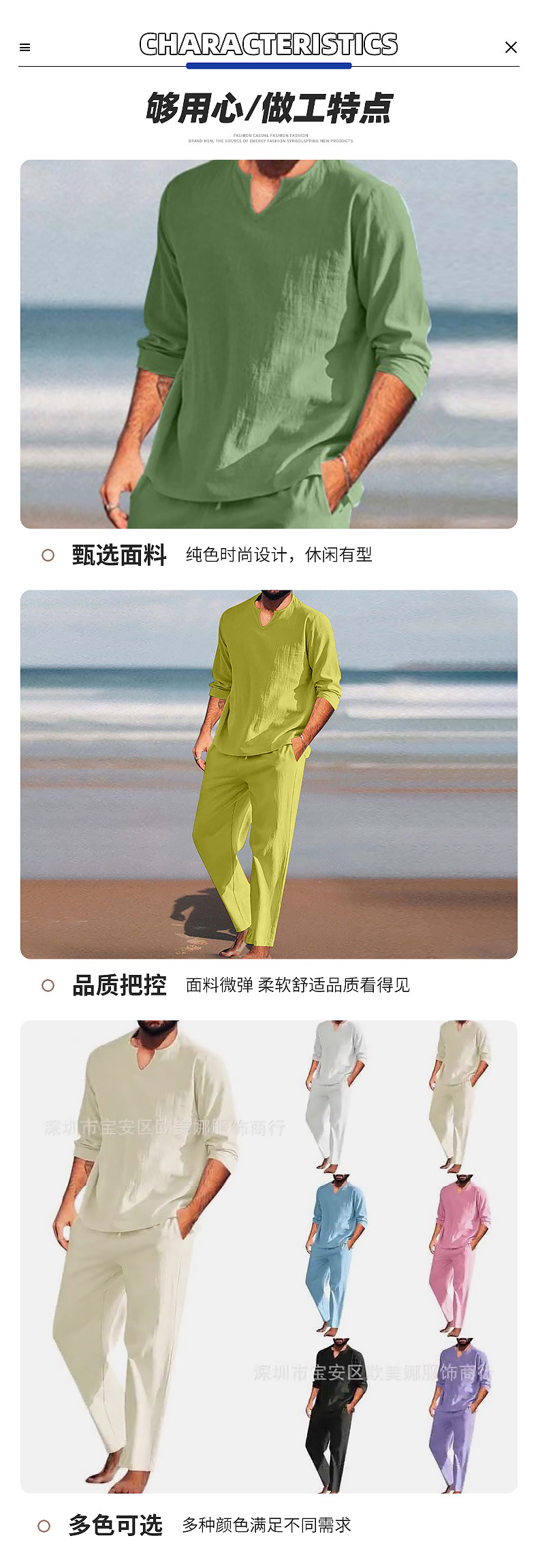 2025 아마존 위시 수출용 남성 캐주얼 단색 포켓 탄성 면마 세트스토어 가기
