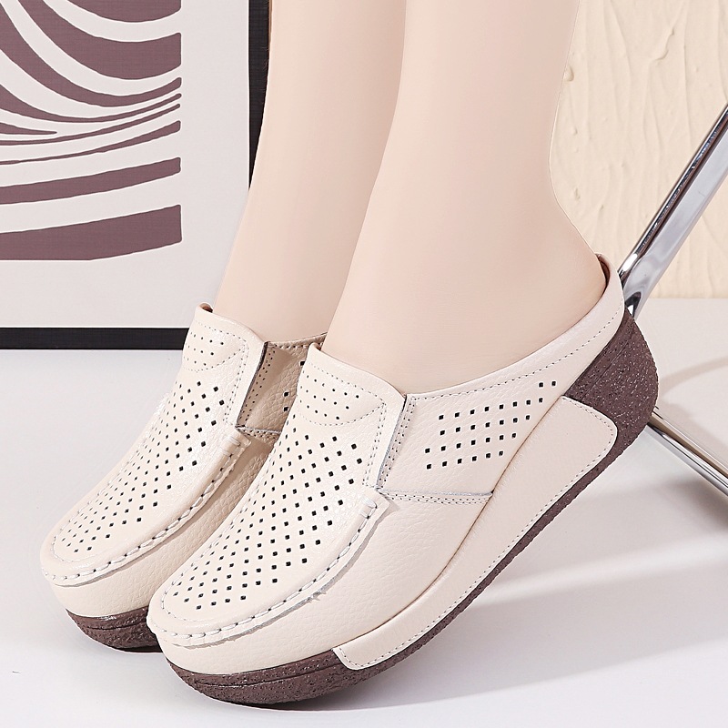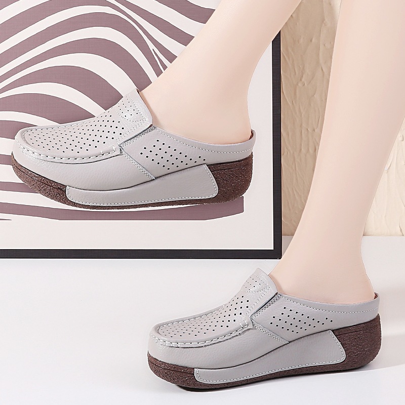 여름용 대형 사이즈 여성 샌들, 두꺼운 밑창, 구멍이 있는 신발, 소가죽 캐주얼 웨지힐, 엄마 신발, 앞코가 둥근 반슬리퍼스토어 가기