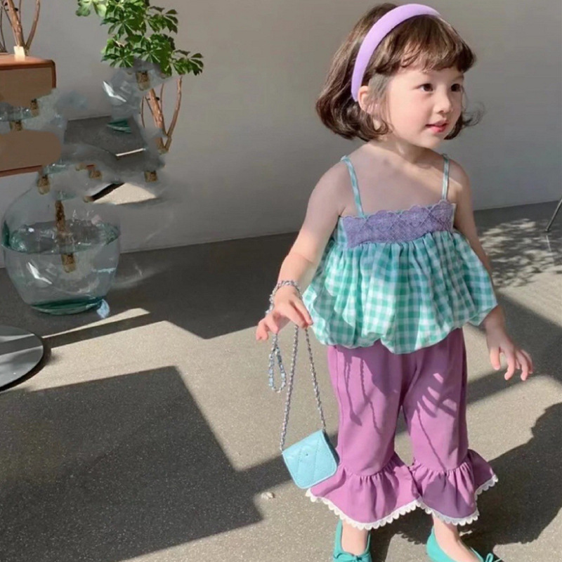 여아용 세트, 끈이 달린 꽃무늬 상의와 나팔바지, 25 여름 신상품, 수출용 아동복, 3-8세용