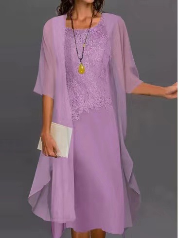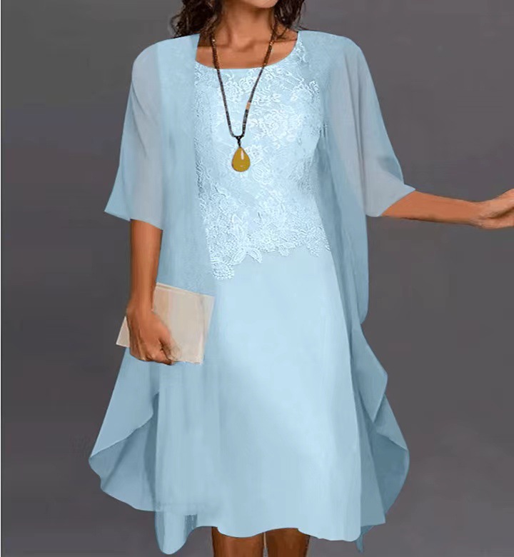 유럽과 미국의 뜨거운 판매 독립 역 아마존 인기 레이스 쉬폰 단색 원피스 투피스 세트 재고 소원