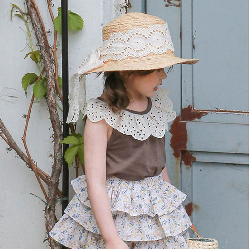2025 여름 딸기 Shan 한국 아동복 소녀 패션 레이스 연꽃 잎 칼라 코튼 티셔츠 재고 있음스토어 가기