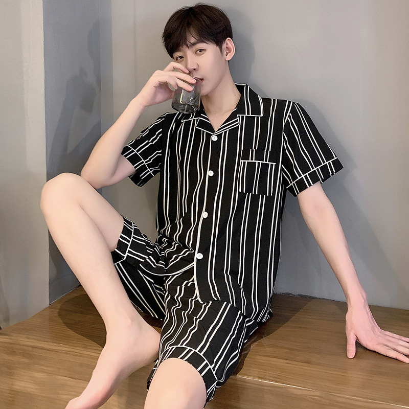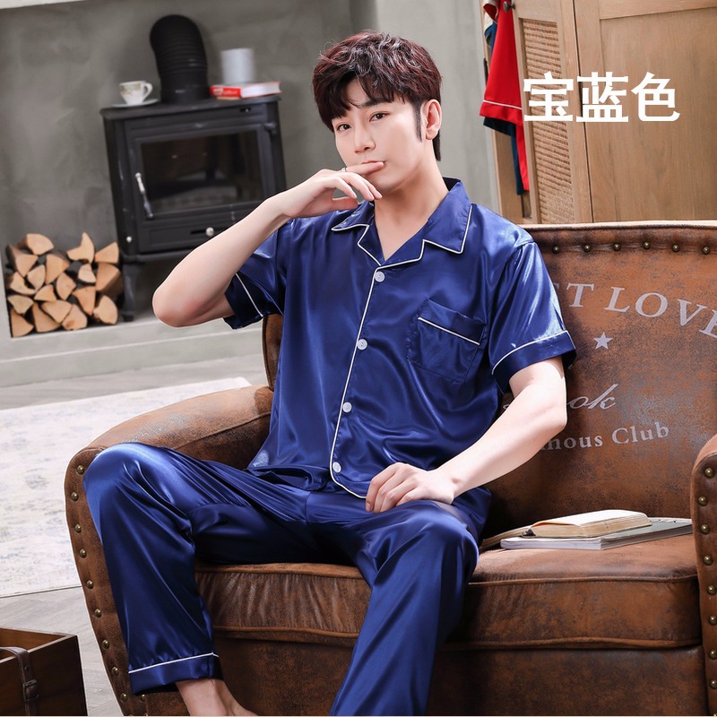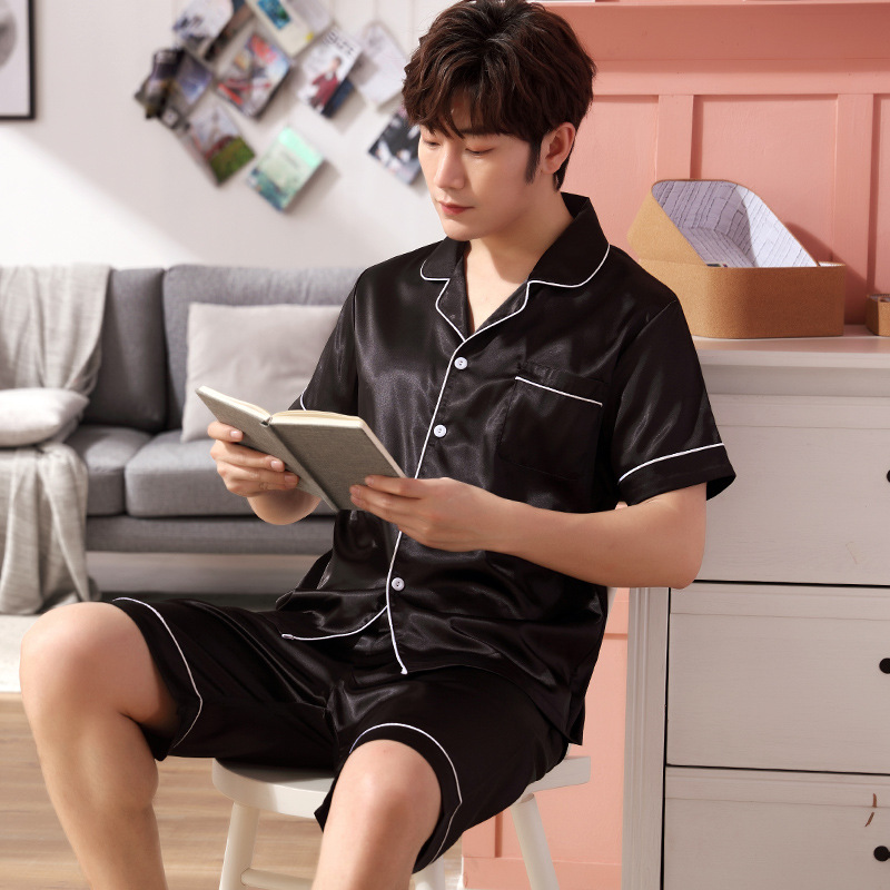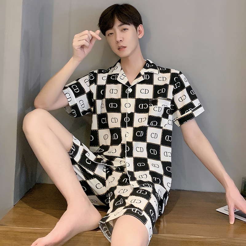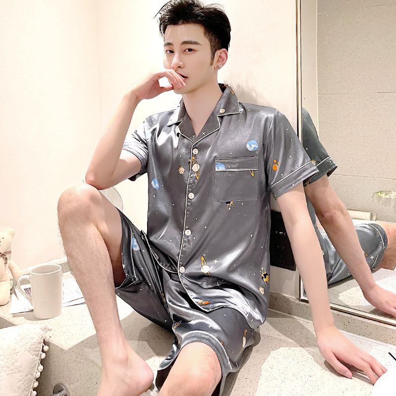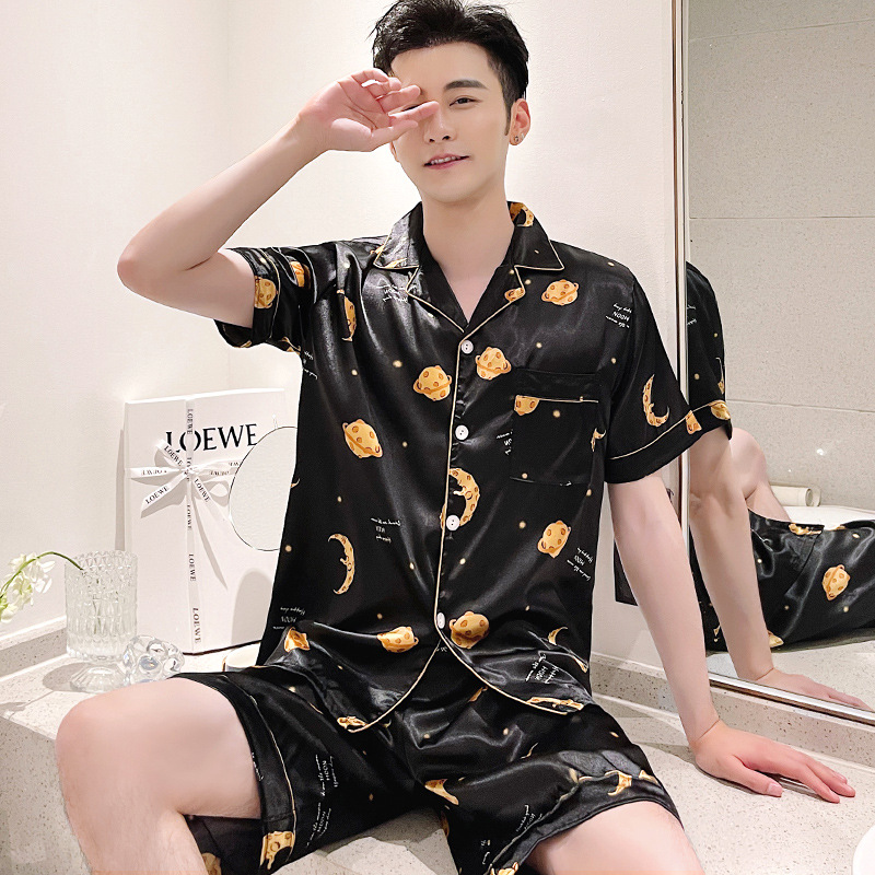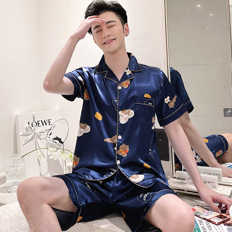 잠옷 남자의 여름 반팔 반바지 얼음 실크 얇은 한국 스타일 만화 남자의 실크 가정 옷 투피스 세트 플러스 사이즈스토어 가기