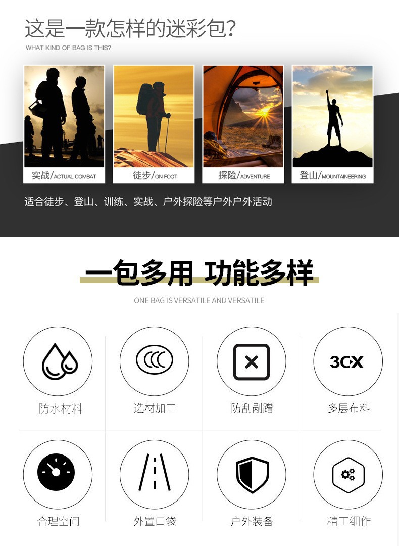 위장 전술 가방 다기능 방수 및 내마모성 등산 가방 야외 하이킹 캠핑 배낭 대형 3P 배낭