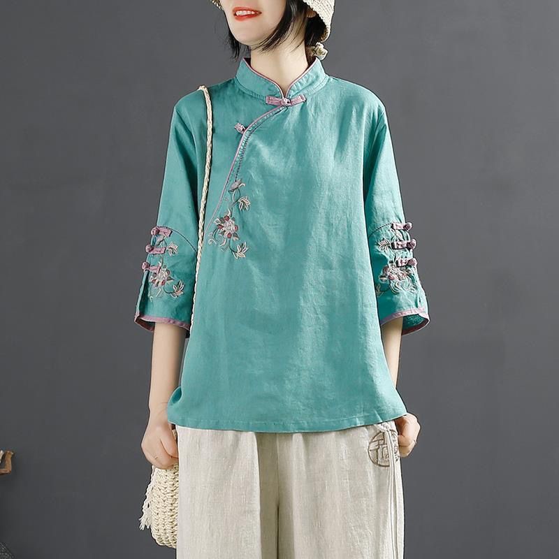 2025 신상 중국풍 레트로 면마 셔츠 여성용 봄 여름 중국식 스탠드 칼라 단추 장식 상의 사선 자수 차복스토어 가기