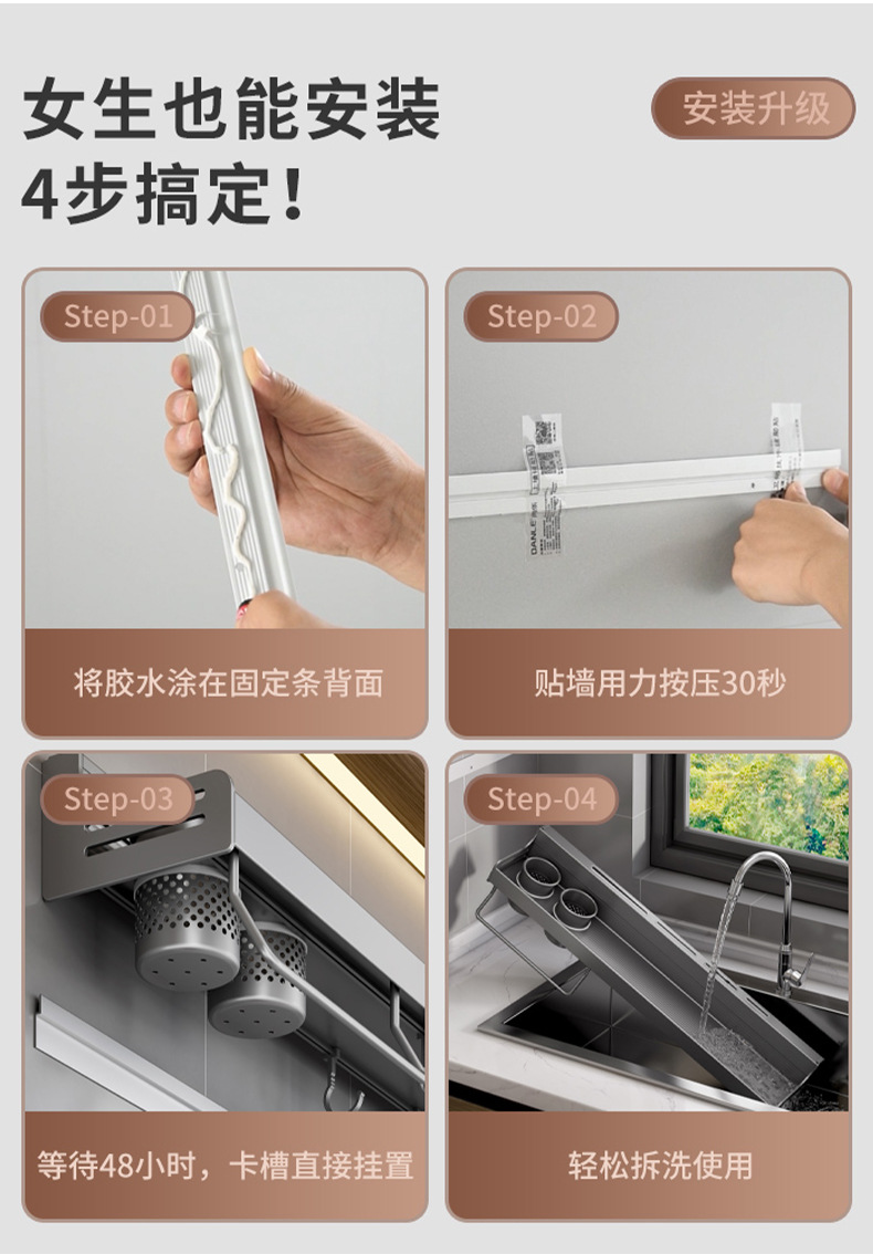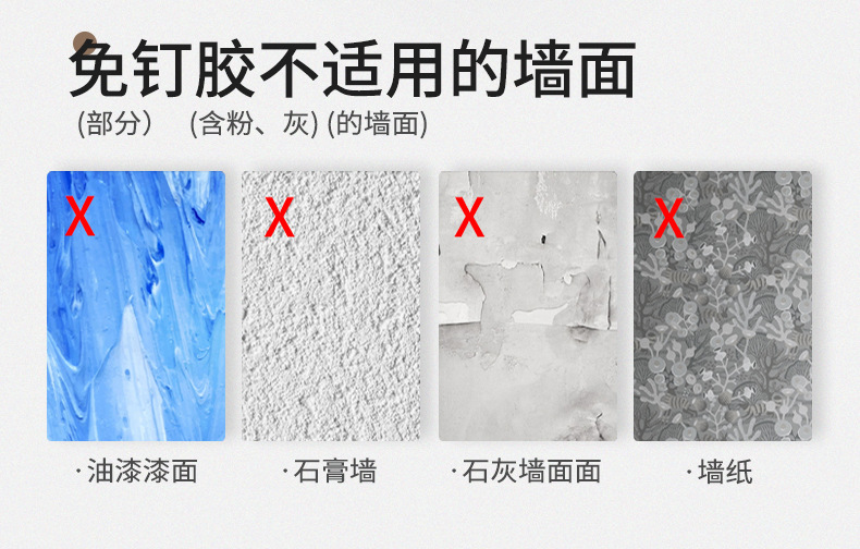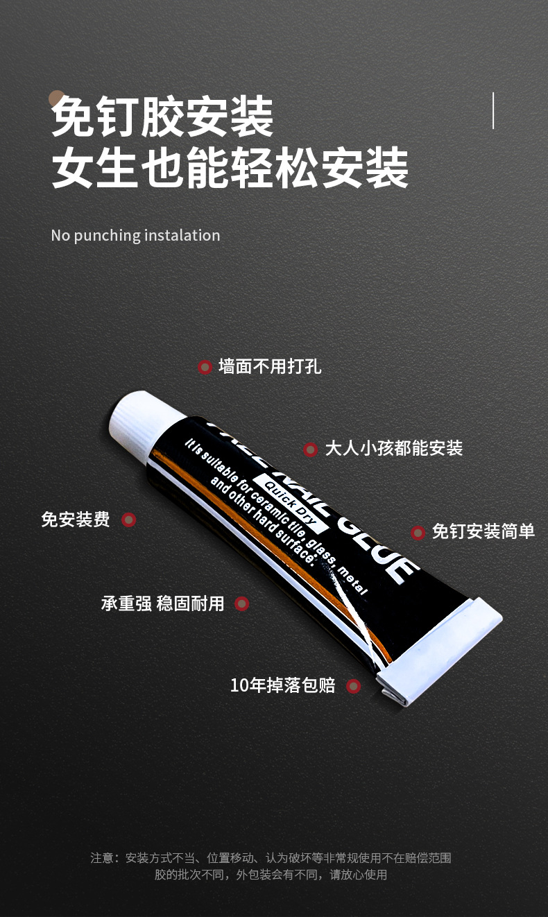 (2)安装请注意,墙面需平整坚固的玻璃瓷砖等。不可用在粉刷墙,墙纸,石灰墙等不平整不坚固的墙面上。涂胶上墙后需等待3-5天,免钉胶完全干透再使用!