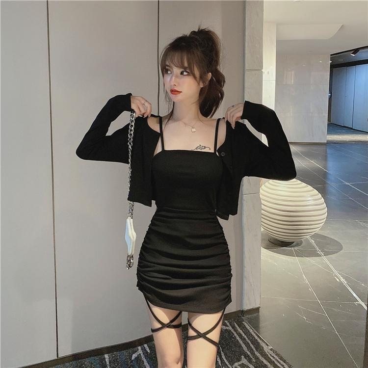 드로스트링 백 힙 스트랩 허리 원피스 + 외부 짧은 긴 소매 카디건 탑 핫 걸 프라이 스트리트 투피스 세트 여성용