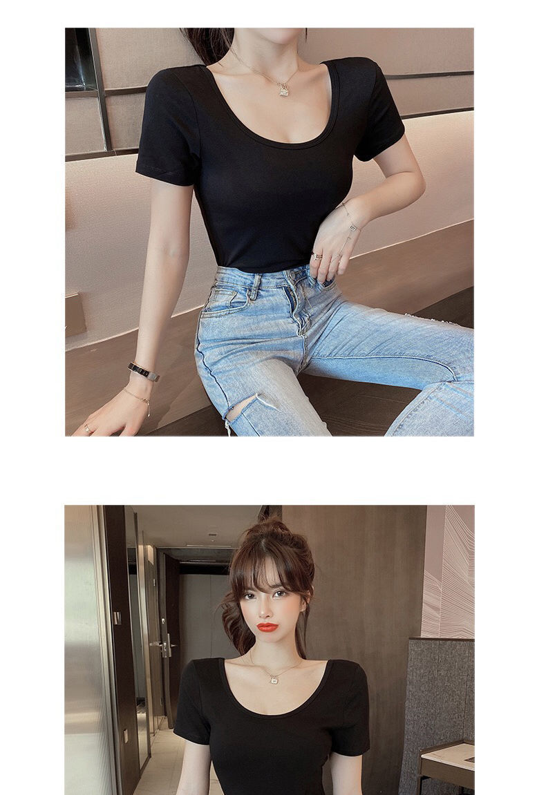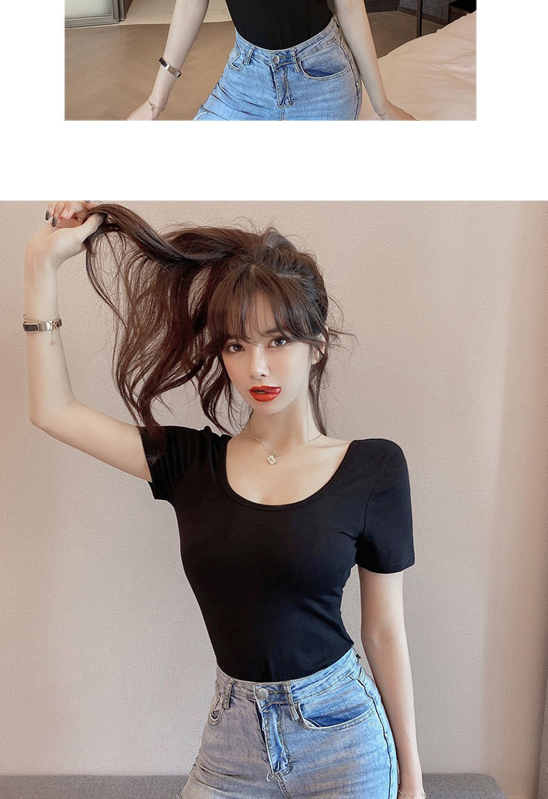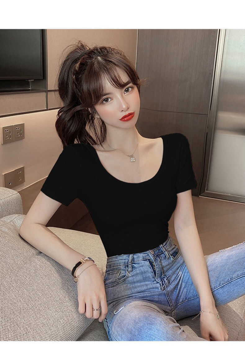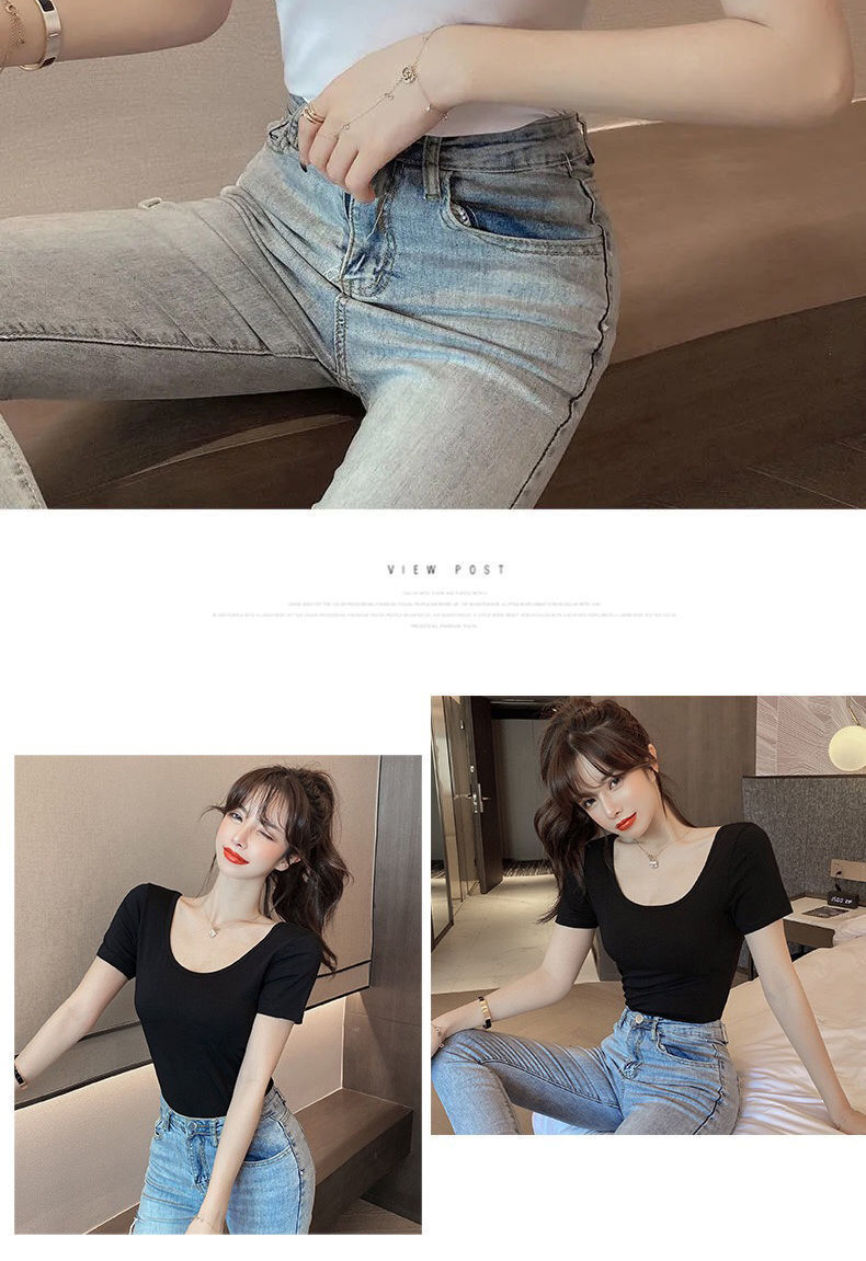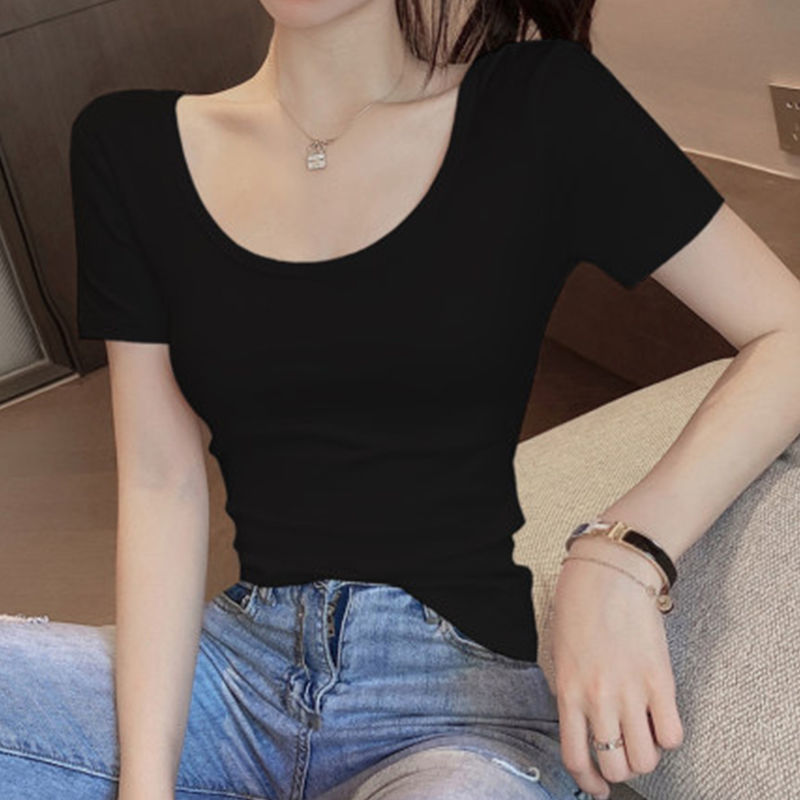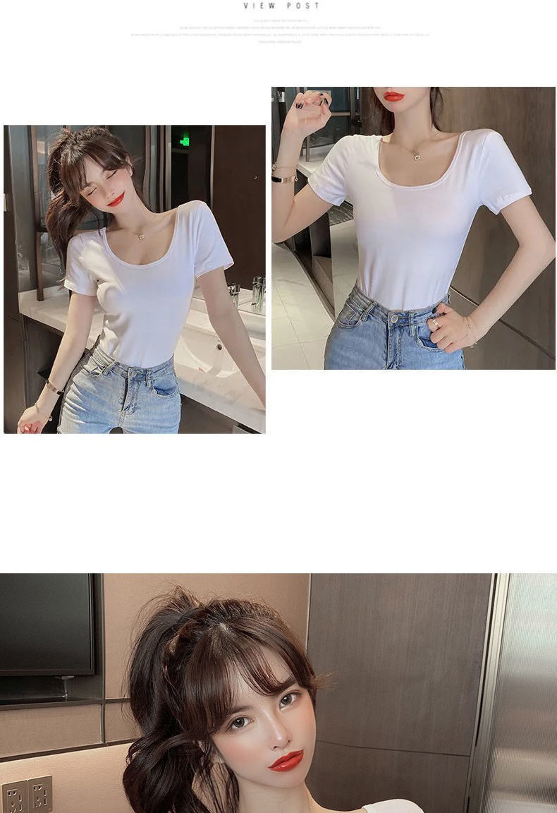흰색 티셔츠 여성 반팔 u 넥 여름 새로운 로우 넥 섹시한 타이트 탑 슬림 바닥 셔츠 도매스토어 가기