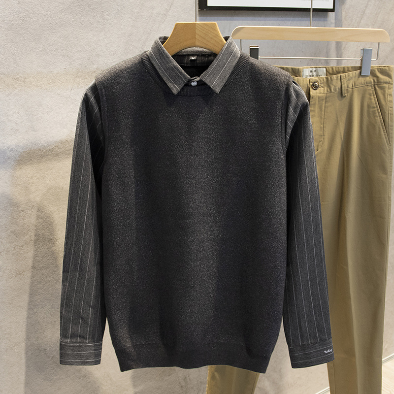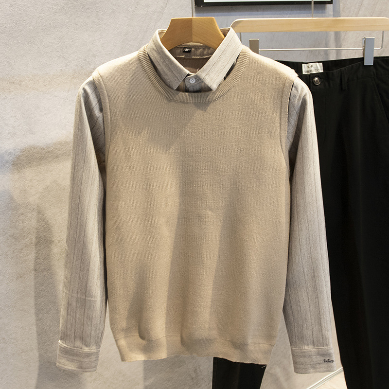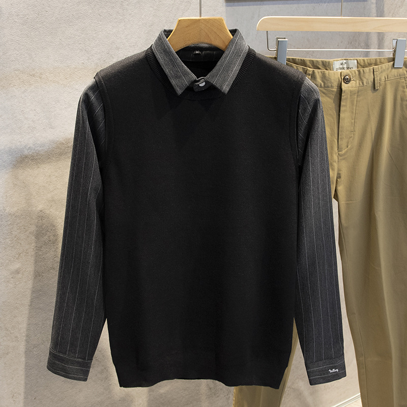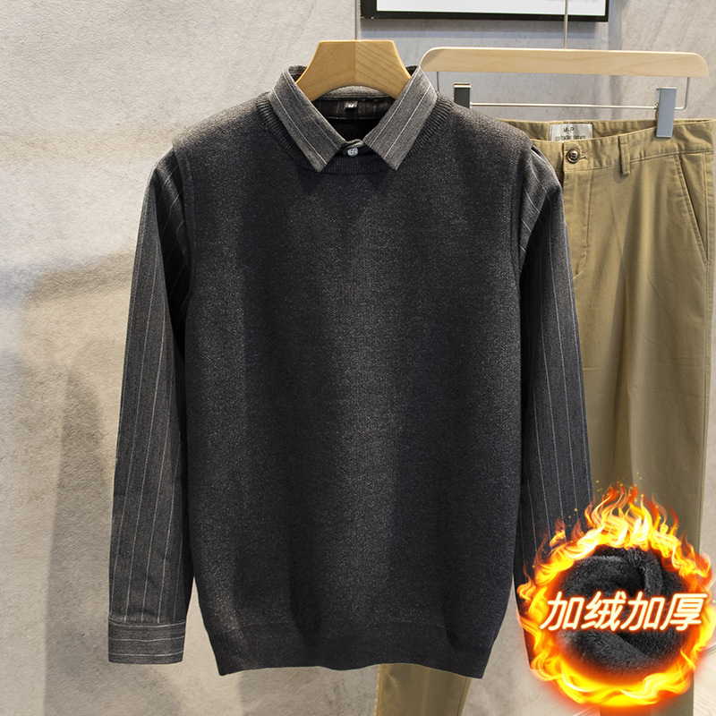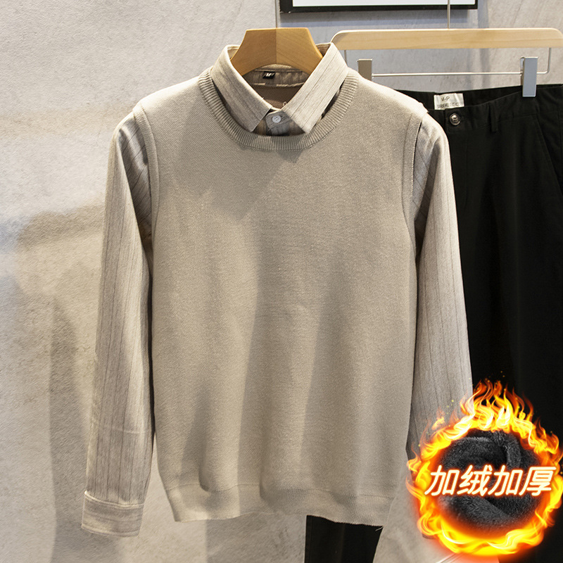가을과 겨울 기모 가짜 투피스 스웨터 남성 셔츠 한국 패션 2023 두꺼운 캐주얼 코트 남성 도매스토어 가기