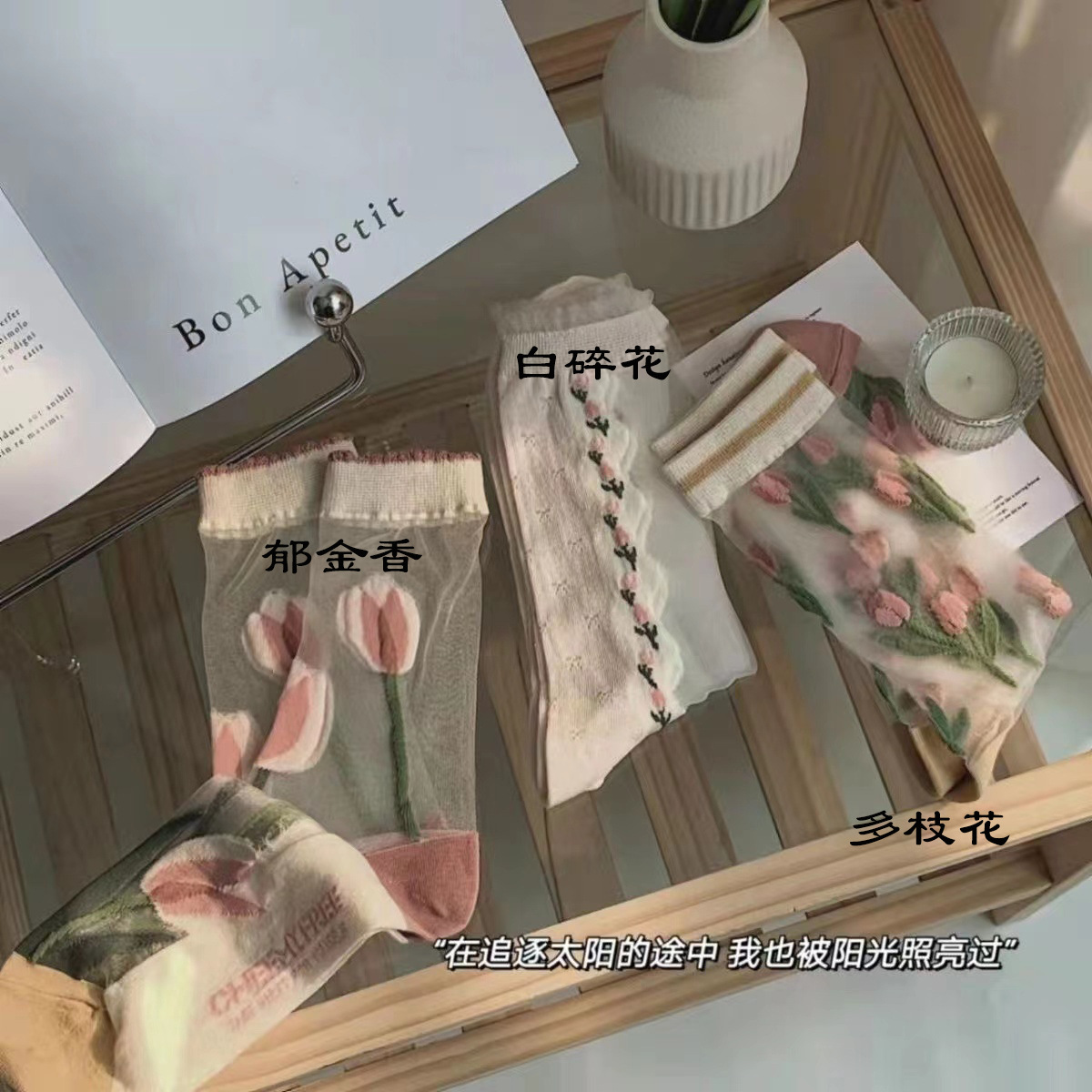 여름 작은 꽃 유리 실크 송아지 길이 양말 튤립 크리스탈 양말 메쉬 꽃 중간 종아리 길이 양말 달콤한 올 매치 봄과 가을스토어 가기