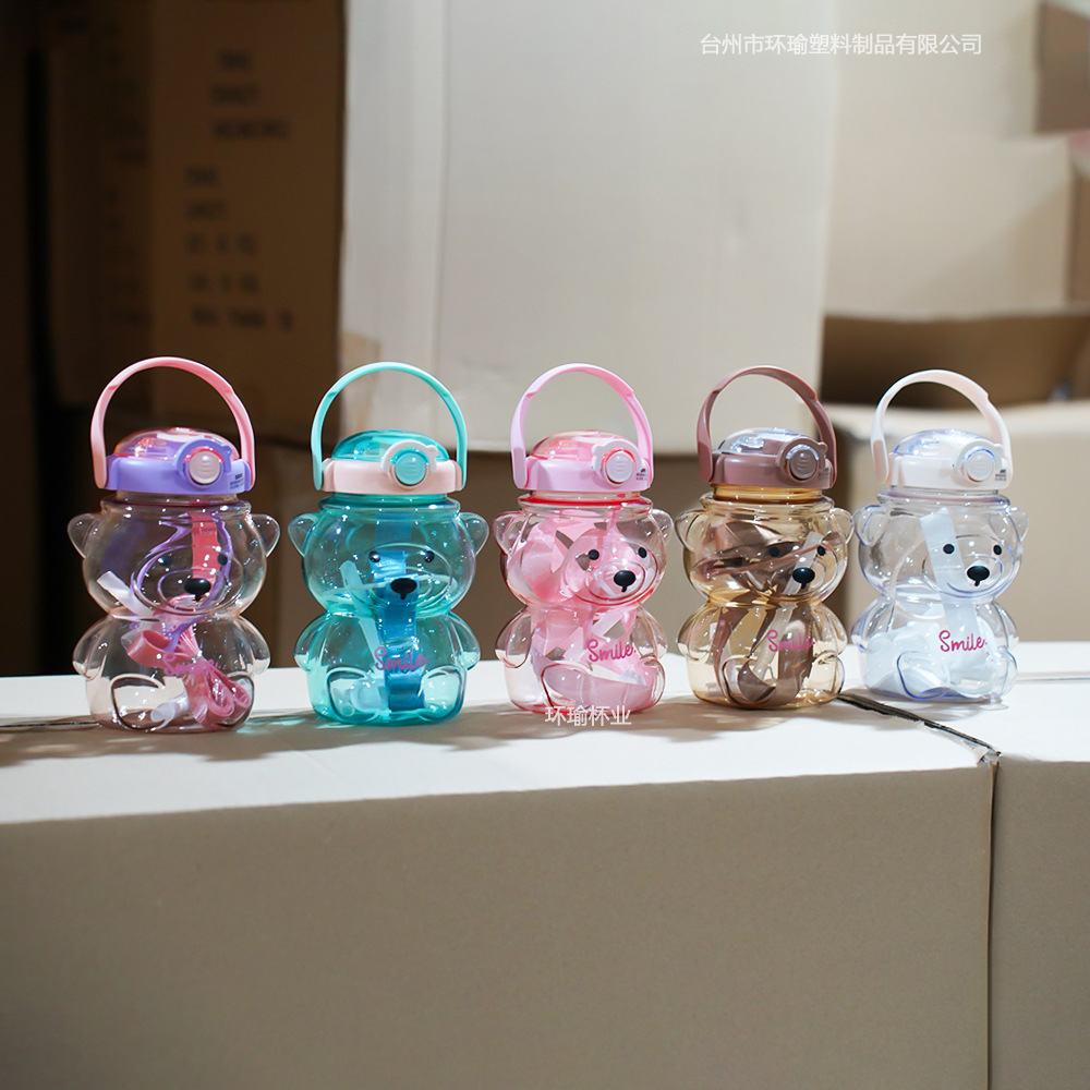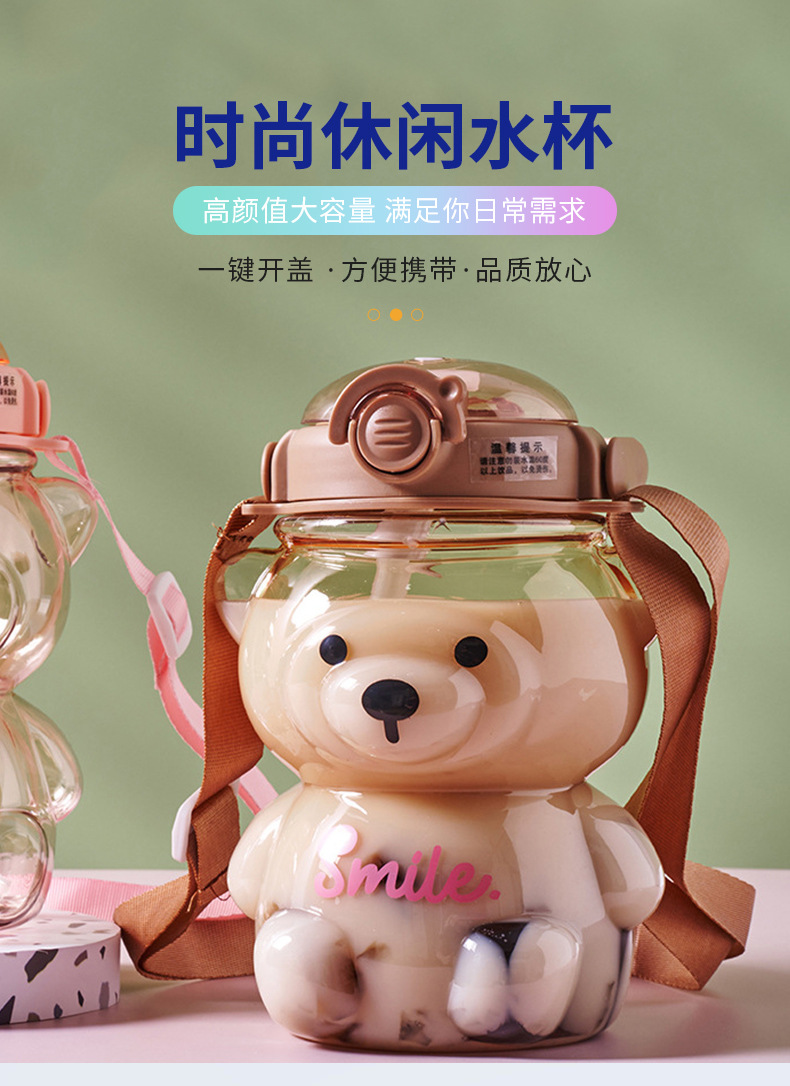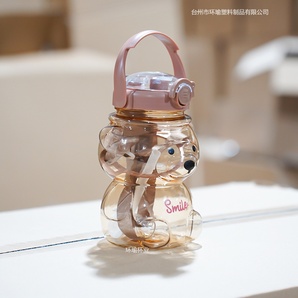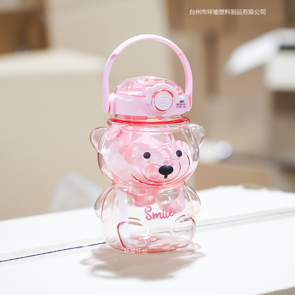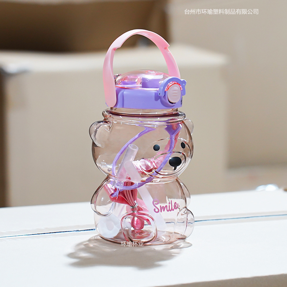 인터넷 유명인 대용량 만화 곰 플라스틱 물컵 빨대 어린이 휴대용 스트랩 물병 귀여운 컵