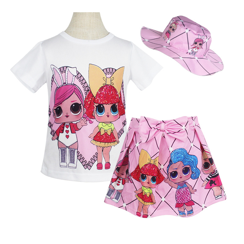2022夏季新款女童惊喜娃娃可爱卡通印花短袖短裙套装百褶裙
