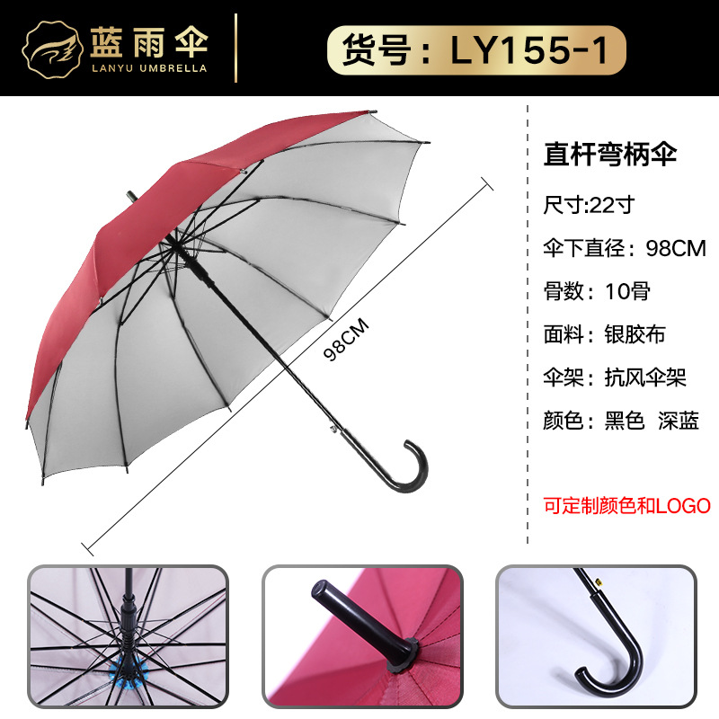 • 스트레이트 막대 우산: 10 뼈 실버 접착제 곡선 손잡이 긴 우산