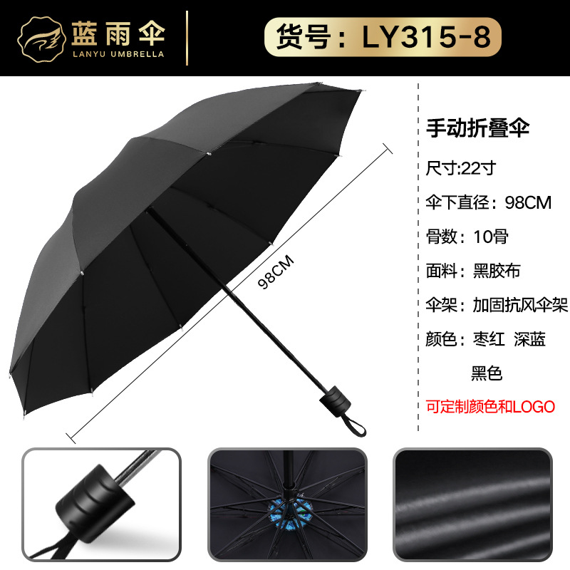 • 접는 우산: 10 뼈 검정 고무 강화 두꺼운 접는 우산