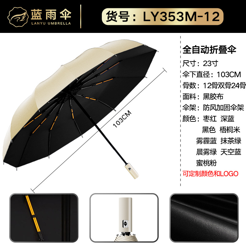 • 접는 우산: 12 본 더블 본 블랙 접착제 자동 우산