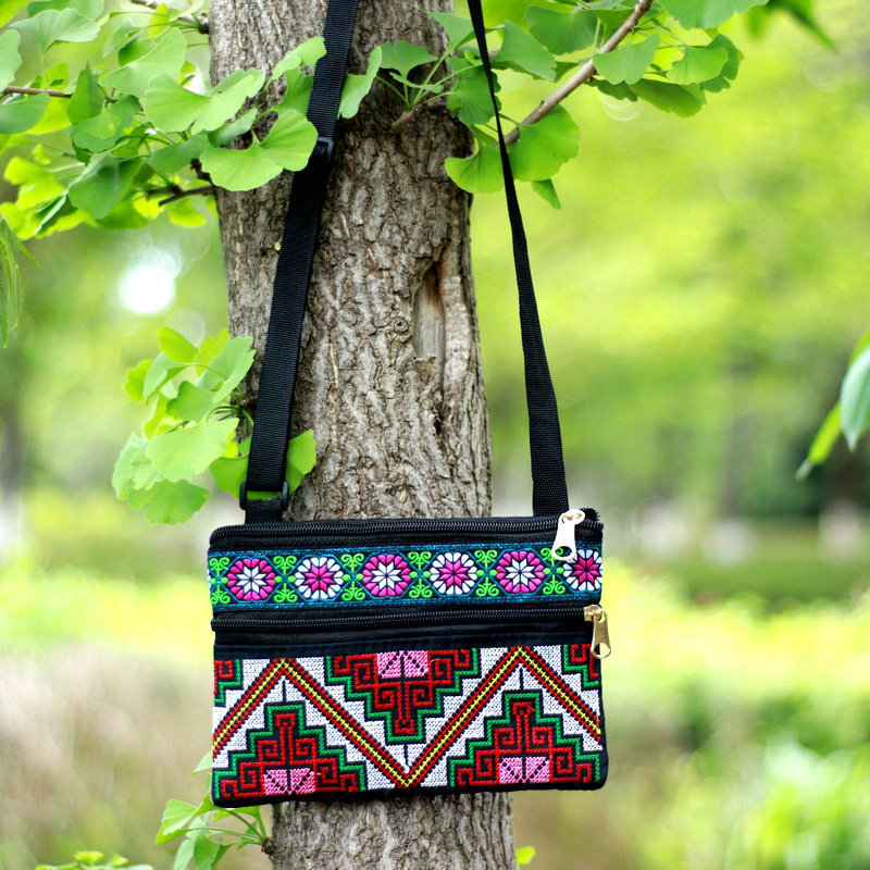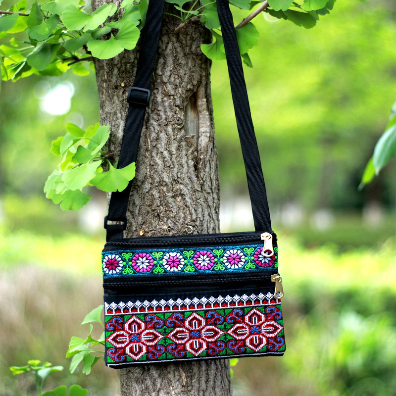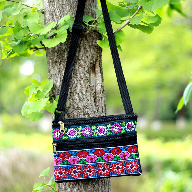 재고 윈난 민족 스타일 자수 가방 중년 및 노인 여성 어깨 3 층 지퍼 자수 크로스 바디 휴대 전화 동전 지갑