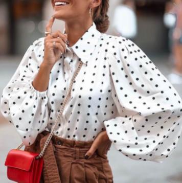 유럽과 미국 패션 옷깃 폴카 도트 느슨한 랜턴 슬리브 쉬폰 셔츠 여성용 긴 소매 셔츠