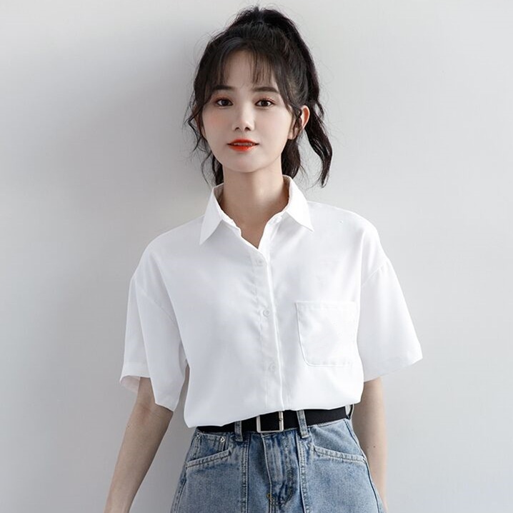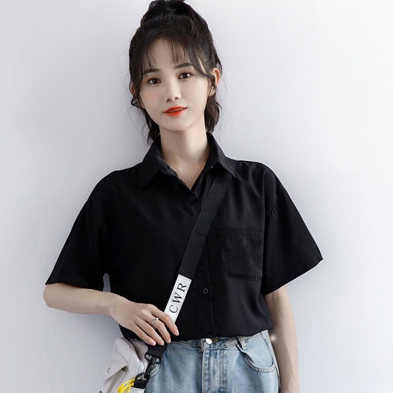 2022 여름 새로운 홍콩 스타일 블랙 반팔 셔츠 여성 여름 학생 캐주얼 쉬폰 셔츠 모든 매치 라펠 탑스토어 가기