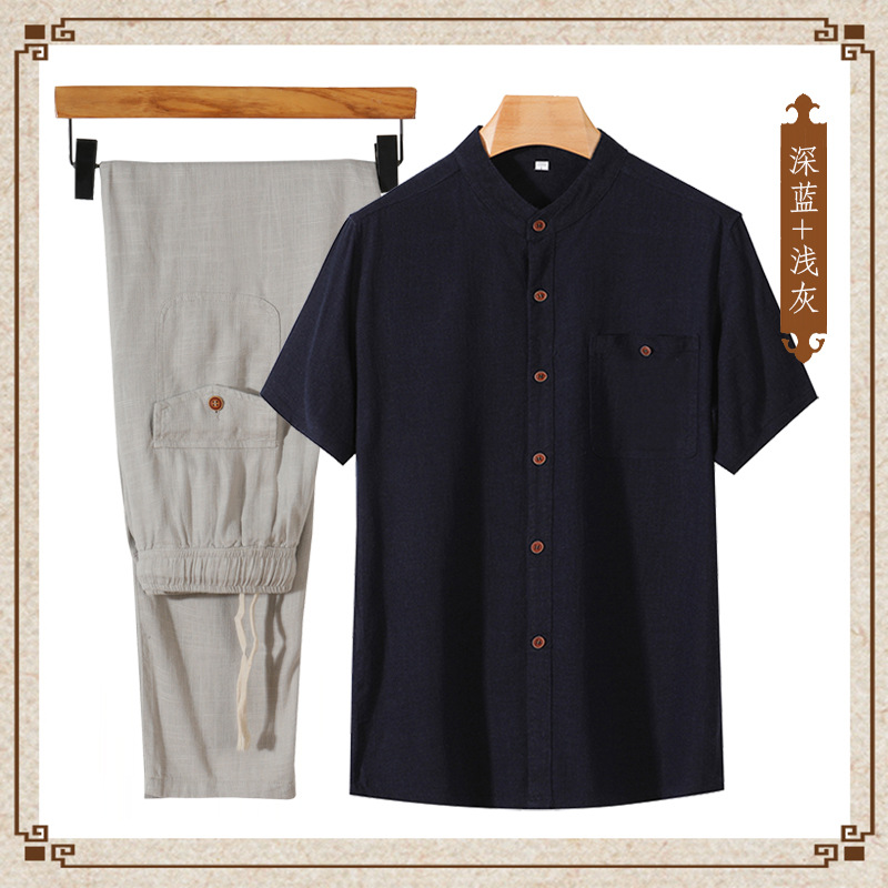 여름 새 린넨 플러스 사이즈 중년 남자의 반팔 셔츠 바지 세트 중국 스타일 남자의 린넨 세트