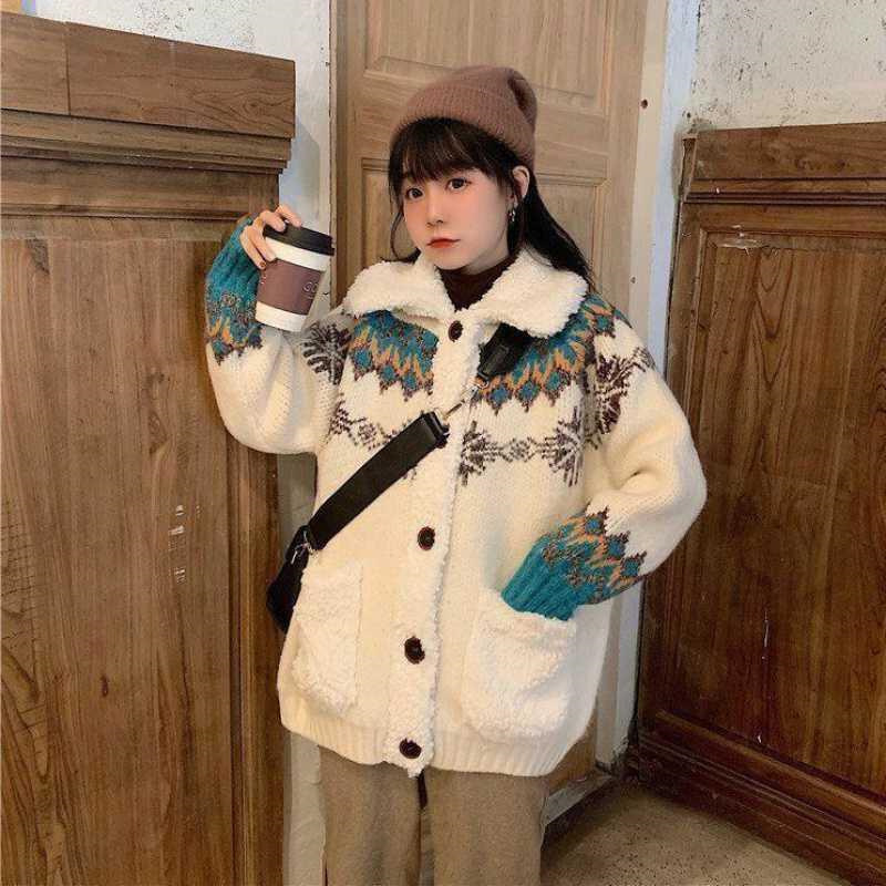 새해 빨간 크리스마스 스웨터 여자의 양고기 봉제 두꺼운 카디건 가을과 겨울 겉옷 게으른 바람 느슨한 롱 코트스토어 가기