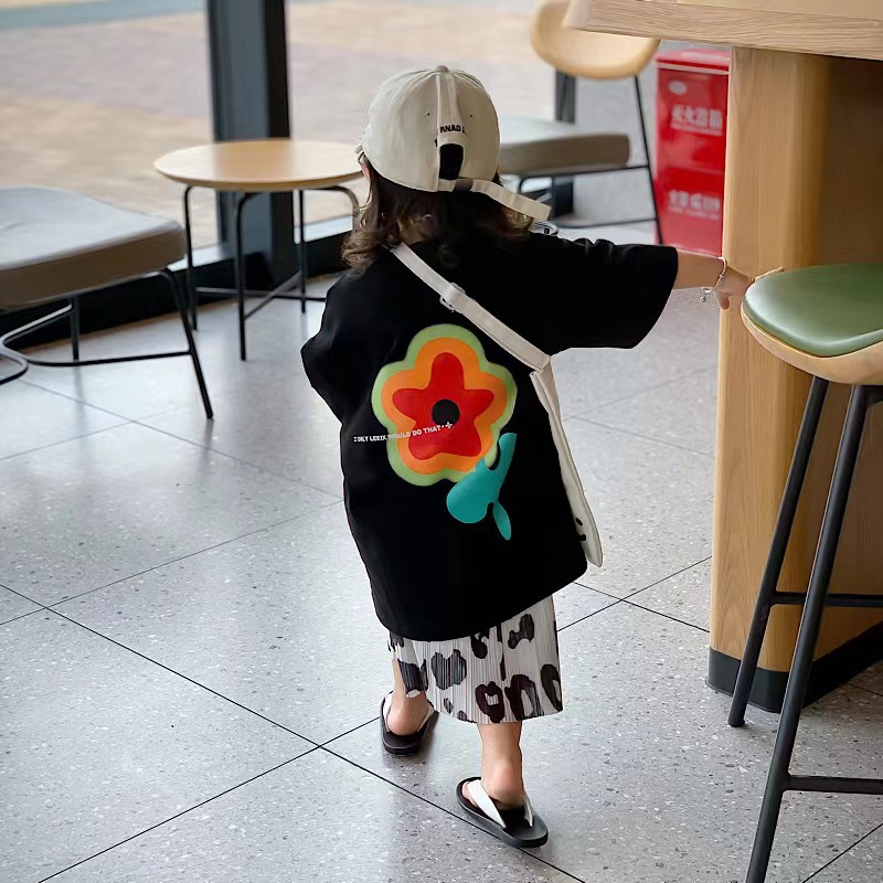 재고 여아 중간 길이 스플릿 티셔츠 2022 여름 새로운 여성의 보물 독특한 포켓 장식 세트