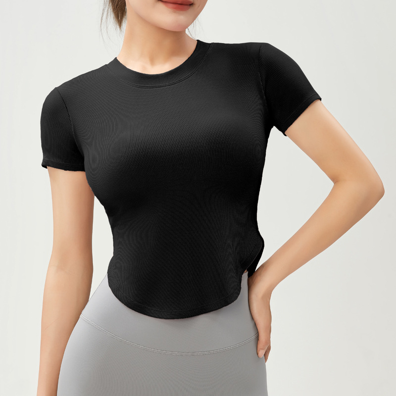 유럽과 미국 봄과 여름 새로운 스포츠 탑 여성 가슴 패드 섹시 러닝 피트니스 반팔 티셔츠 알몸 요가 옷