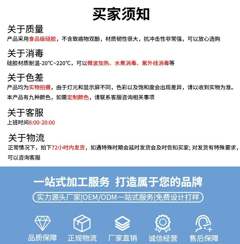 【材质】:食品级硅胶,不含BPA,符合美国FDA严格检测。LFGB标准材质价格另议! 材料有FDA,LFGB检测报告。产品材质柔软,无尖锐棱角,宝宝玩起来妈妈更放心!