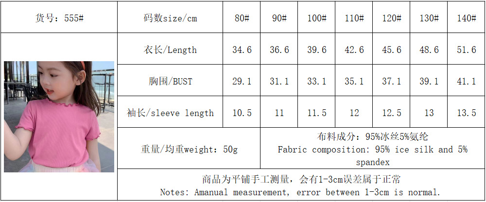 아이스 실크 반팔 티셔츠, 여아 및 유아용 한국 스타일 여름 의류, 다용도 스트라이프 귀단 장식 상의, 어린이 및 중년 어린이를 위한 캐주얼하고 다용도