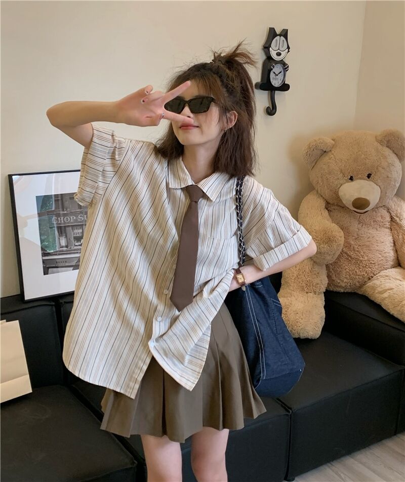 학생용 투피스 세트 홍콩 스타일 스트라이프 셔츠 고대 예술적 신선한 반팔 POLO 칼라 셔츠 + 플리츠 스커트스토어 가기