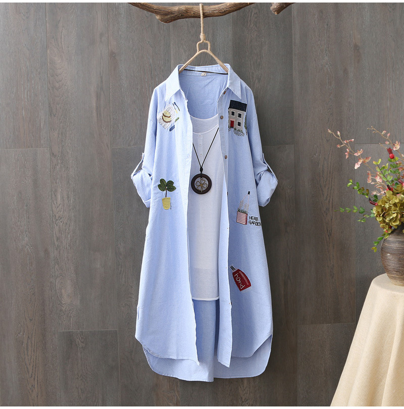 여름 신작 아티스틱 자수 루즈한 중간 길이 자외선 차단 셔츠 여성용 봄과 가을 한국식 면 올매치 캐주얼 셔츠스토어 가기