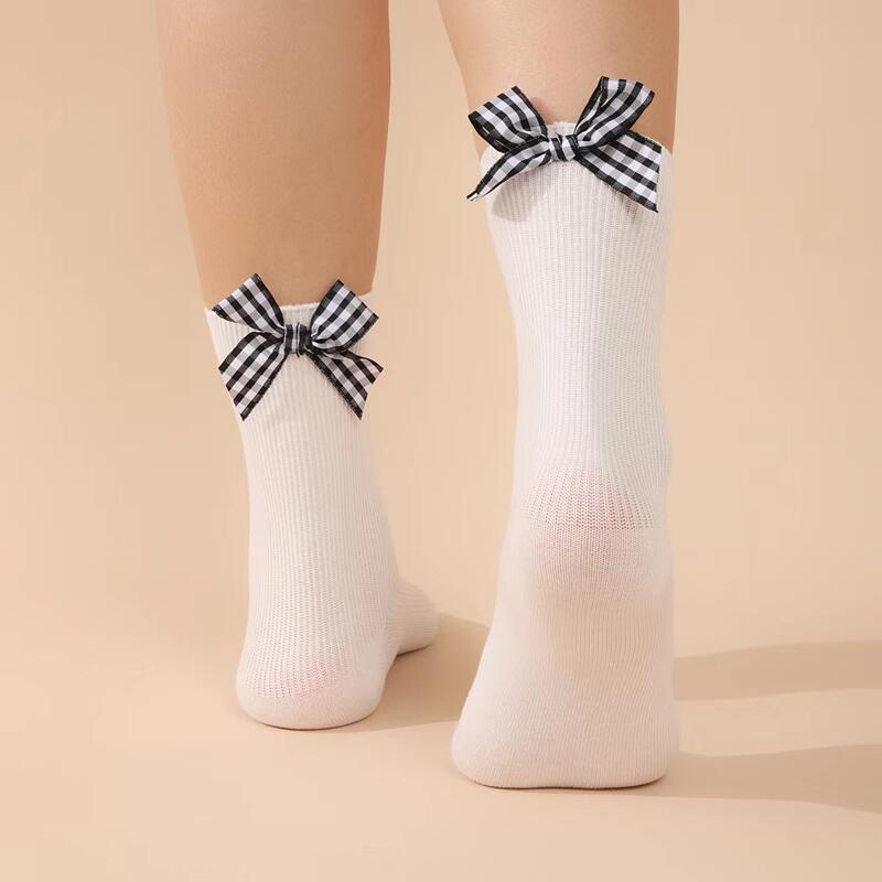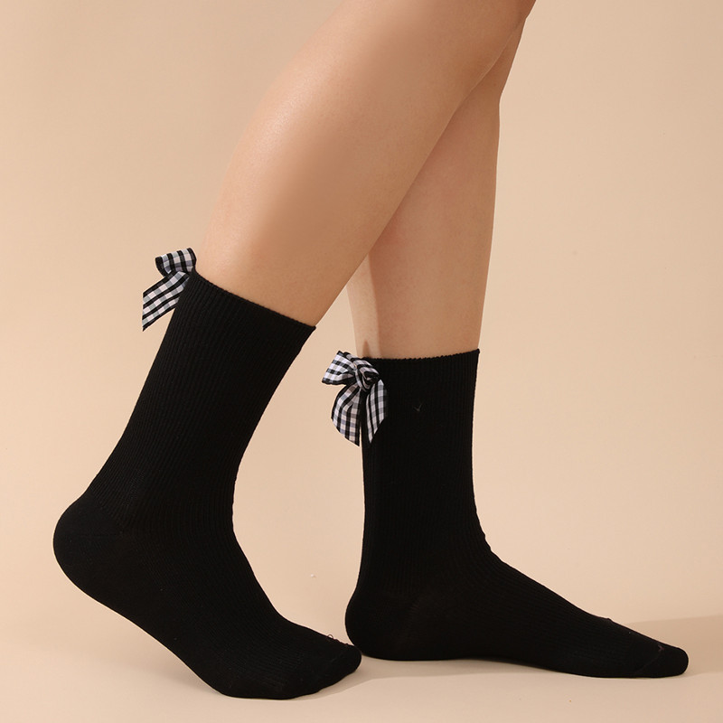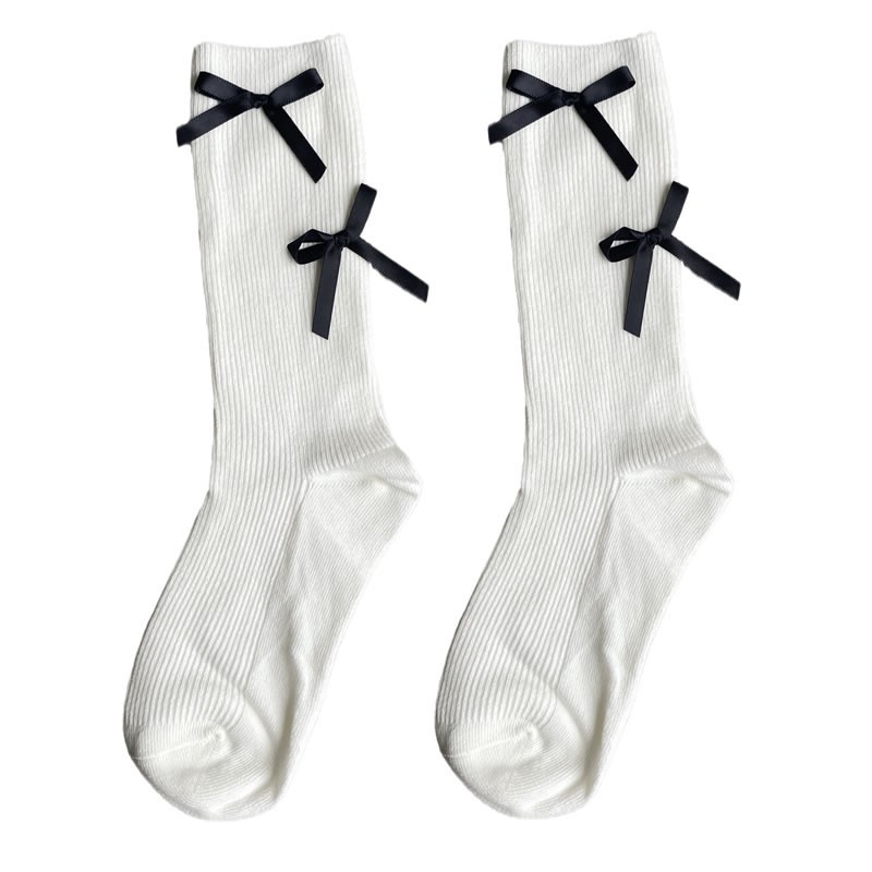 Lolita bowknot 송아지 양말면 여성 중간 송아지 양말 흑백 대비 색상 대학 스타일 패션 면화 양말