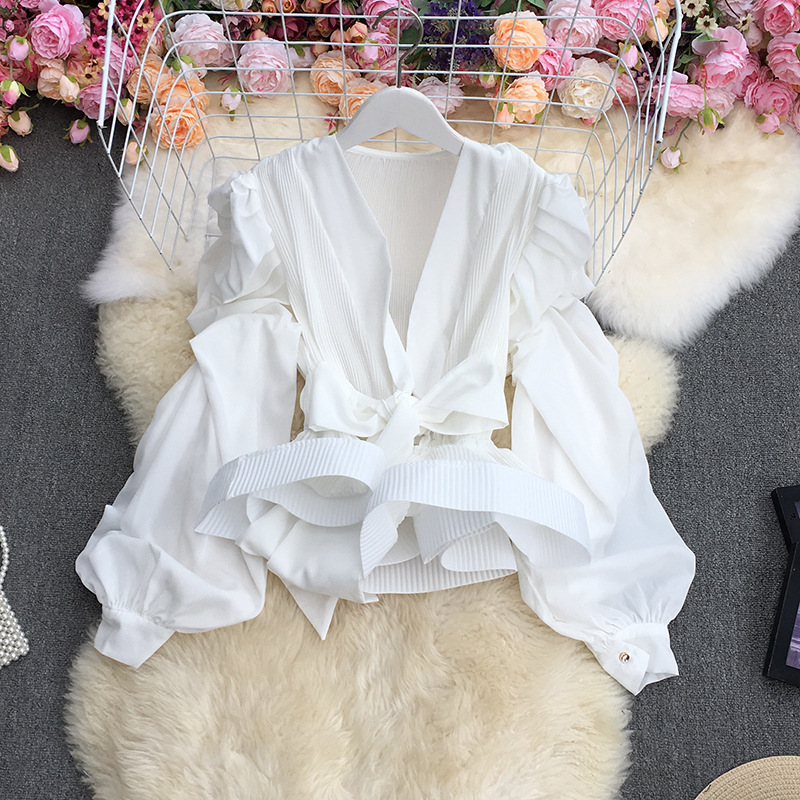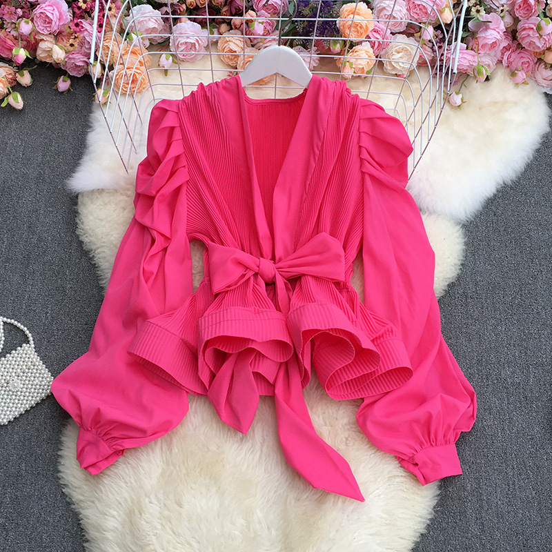 기질 스트랩 타이트 웨이스트 솔리드 컬러 보우 셔츠 여성용 한국식 플리츠 스커트 버블 롱 슬리브 탑스토어 가기