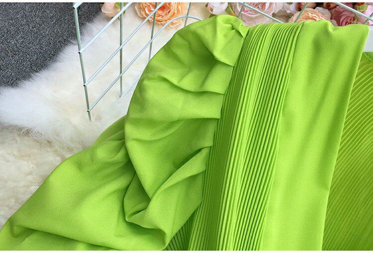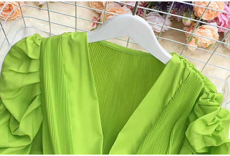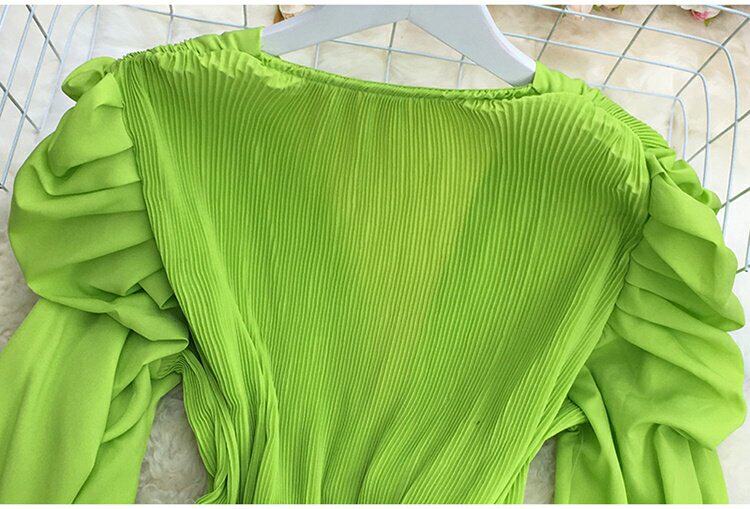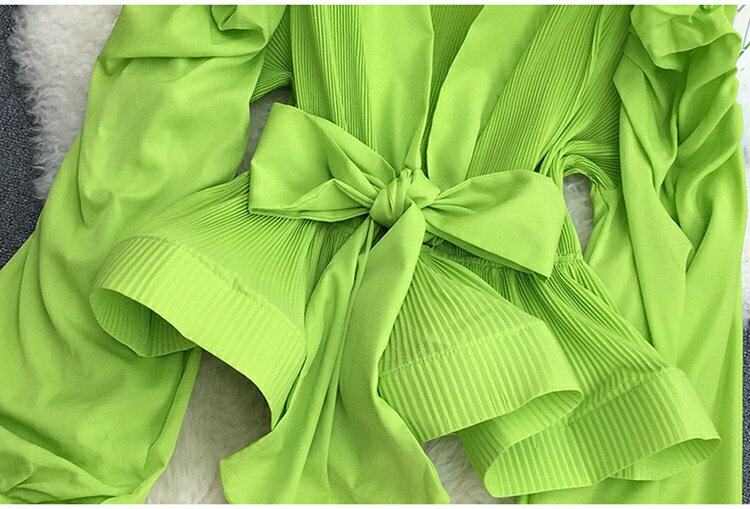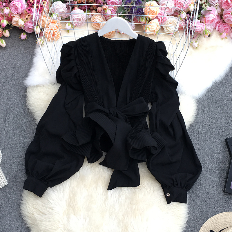 기질 스트랩 타이트 웨이스트 솔리드 컬러 보우 셔츠 여성용 한국식 플리츠 스커트 버블 롱 슬리브 탑