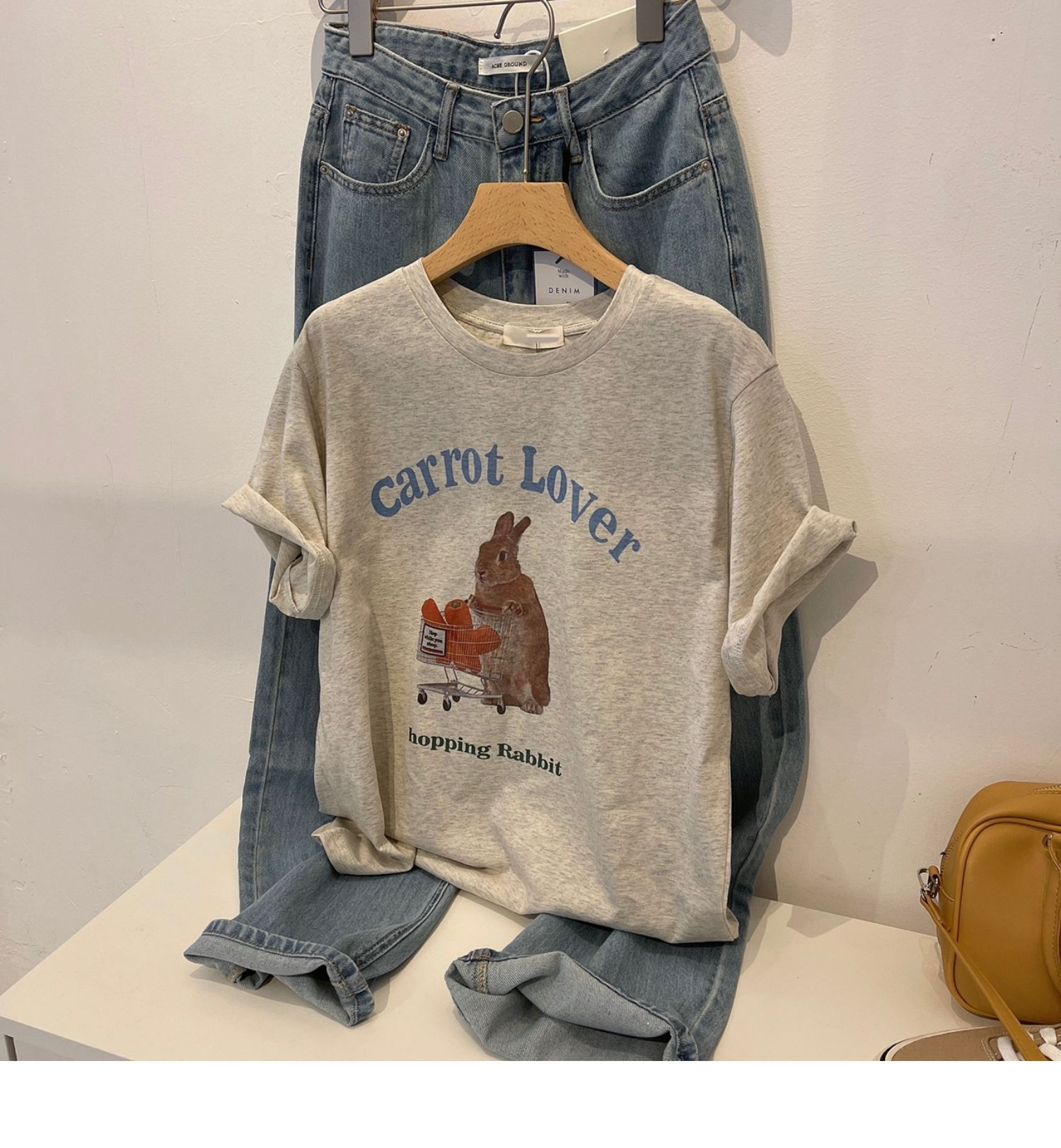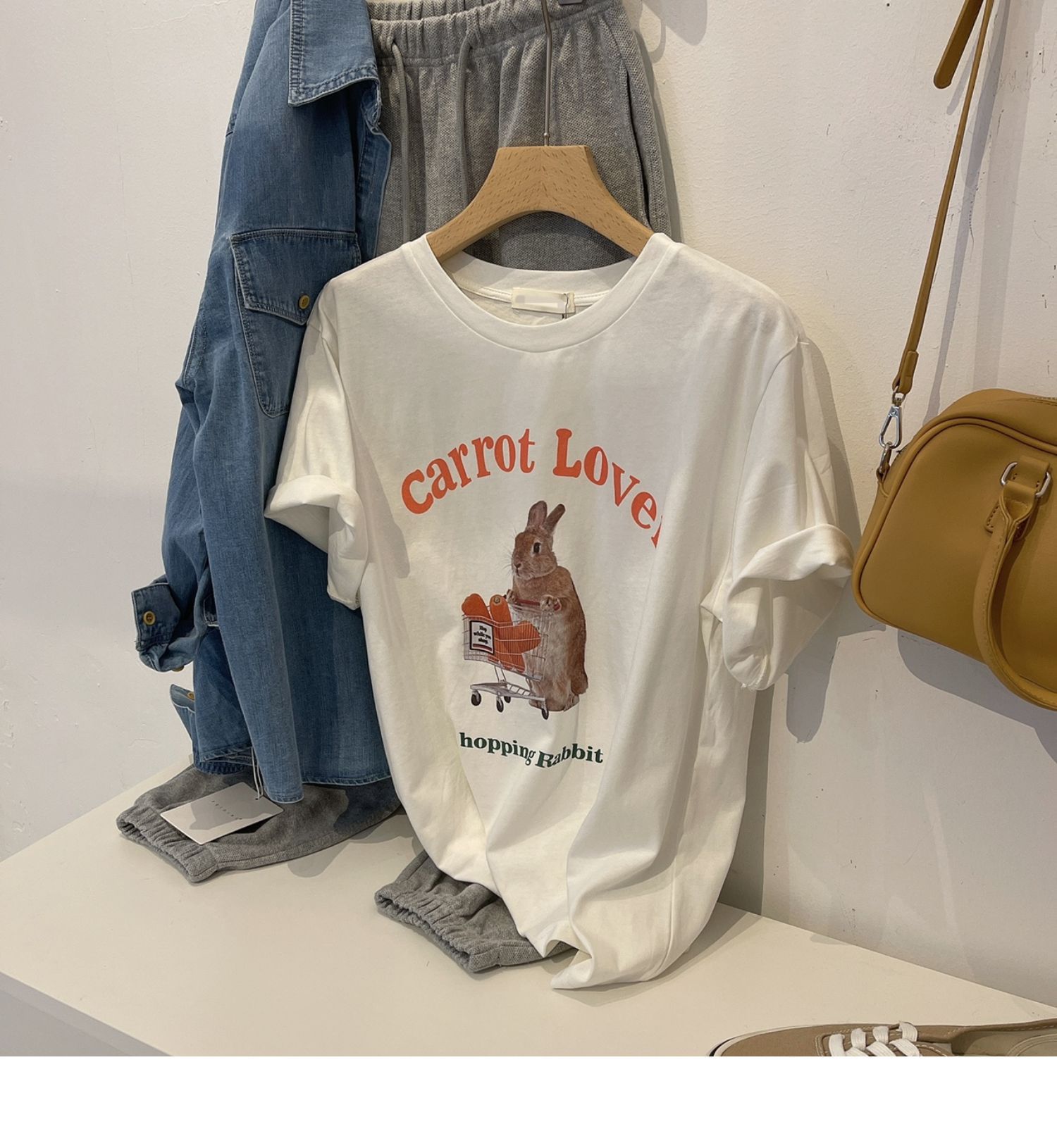 순수 코튼 반팔 티셔츠 여성 오른쪽 어깨 여름 귀여운 프린트 새 여성 라운드 넥 느슨한 반팔 티셔츠 탑스토어 가기