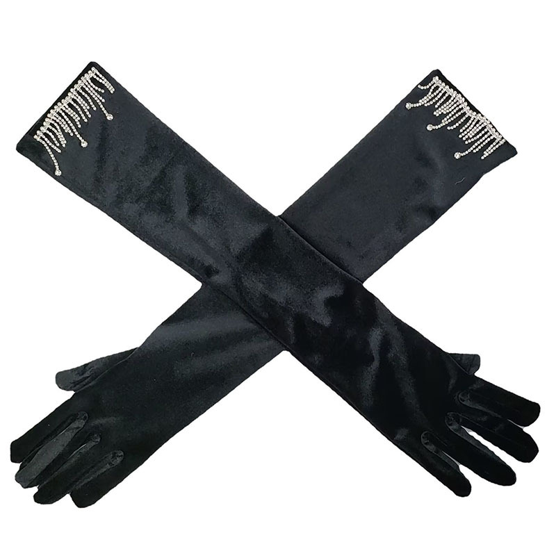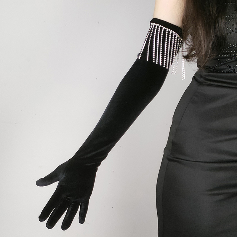 레트로 벨벳 라인스톤 태슬 롱 장갑 퍼포먼스 댄스 파티 벨벳 이브닝 드레스 장갑 댄스 파티 액세서리