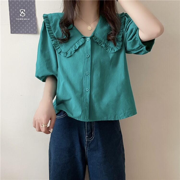 여름 반팔 인형 칼라 셔츠 여성의 디자인 감각 틈새 프랑스 탑 레트로 홍콩 스타일 우아한 쉬폰 셔츠
