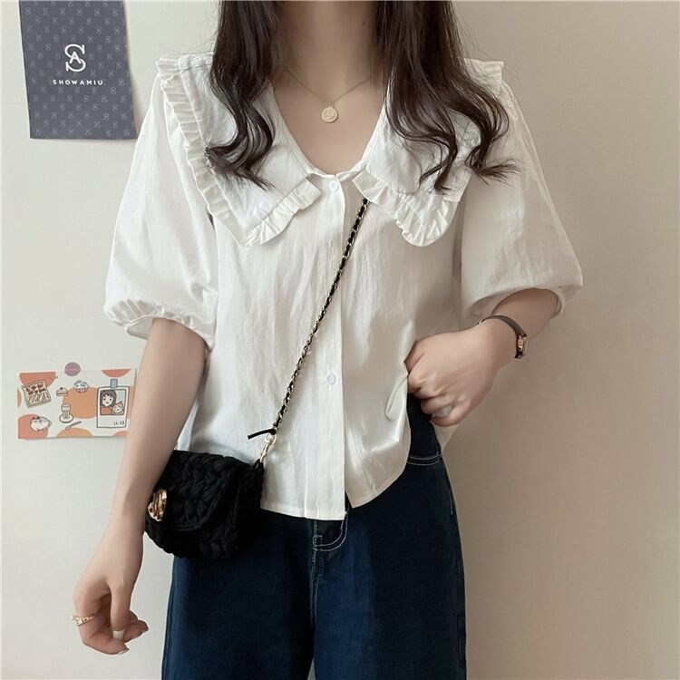 여름 반팔 인형 칼라 셔츠 여성의 디자인 감각 틈새 프랑스 탑 레트로 홍콩 스타일 우아한 쉬폰 셔츠스토어 가기