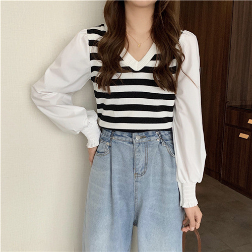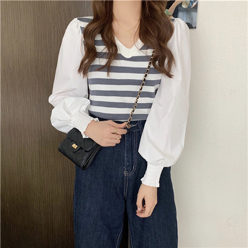 스트라이프 쉬폰 니트베이스 셔츠 여성용 2022 인기 이른 봄 새로운 스타일 외국 스타일 V-넥 시크 탑