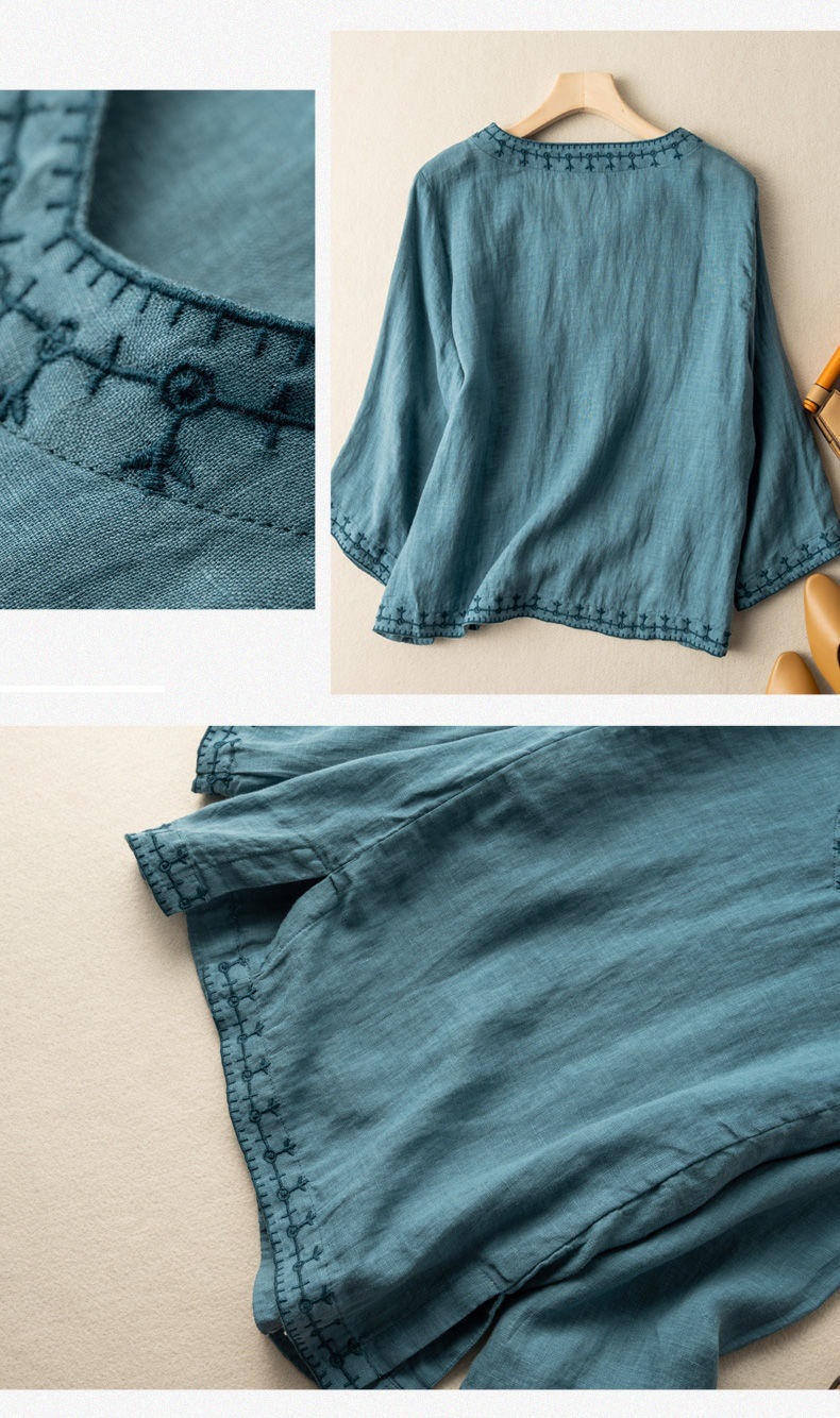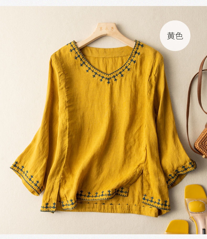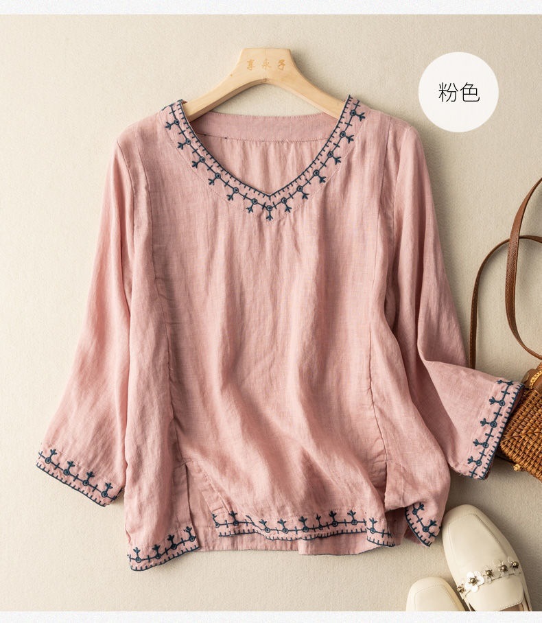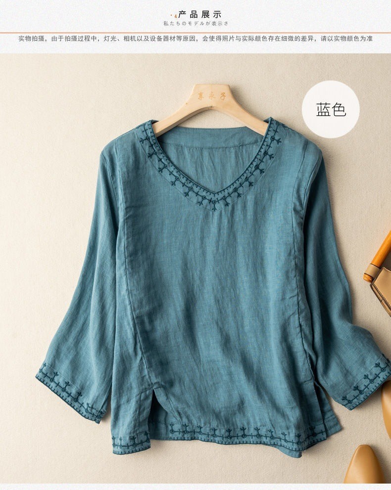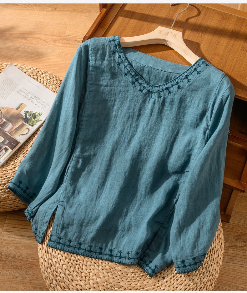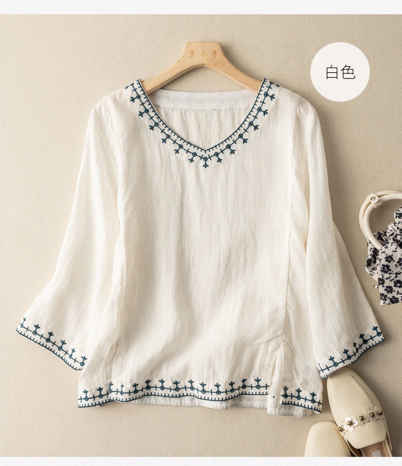 세븐부 소매 자수 면 및 린넨 탑, 예술적 복고풍 디자인, 여성용 얇은 셔츠, 루즈한 2024 봄 여름 새로운 트렌드