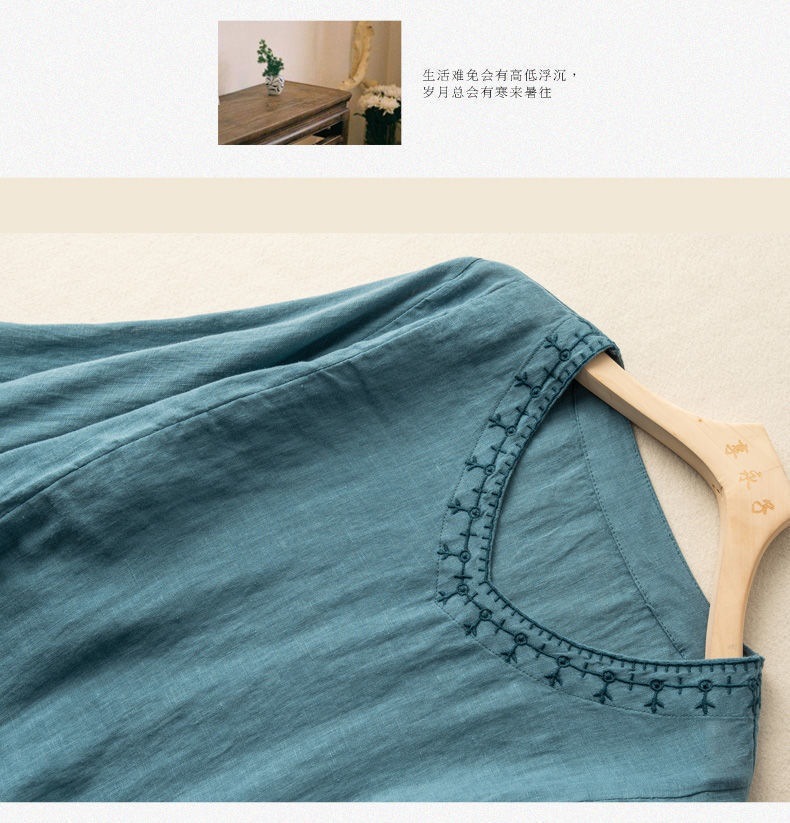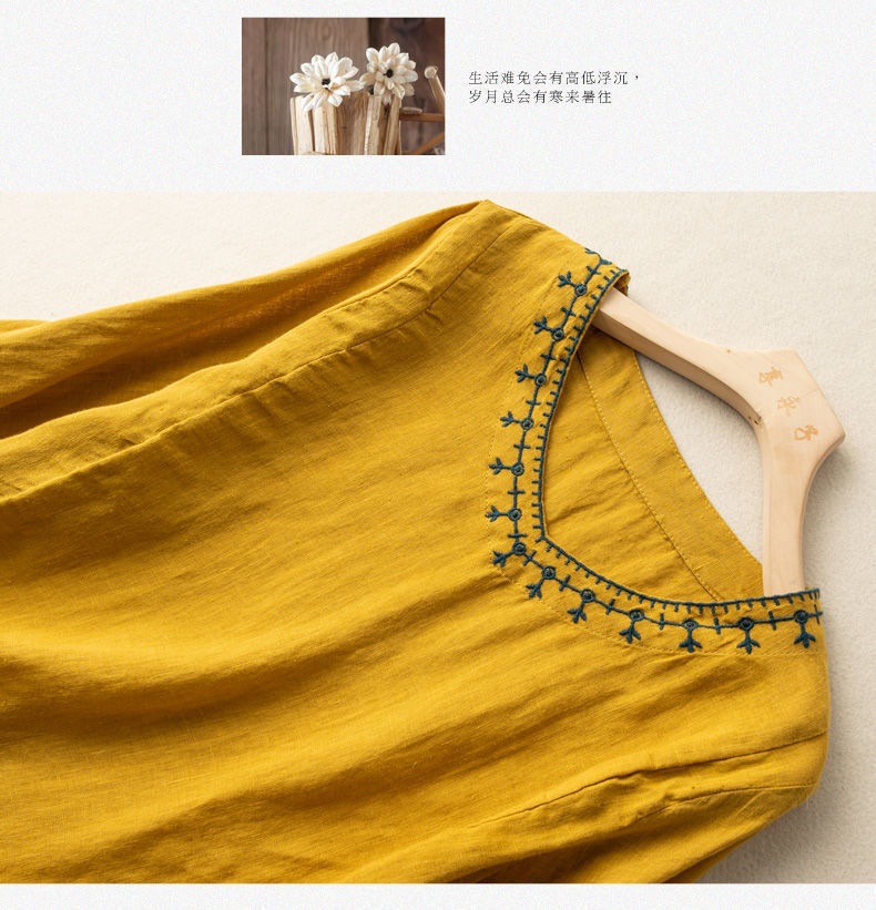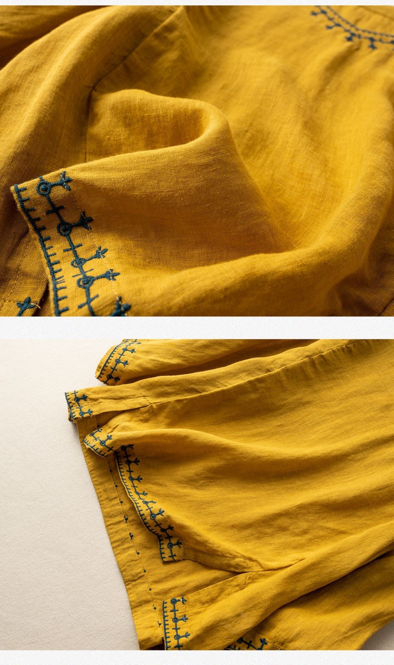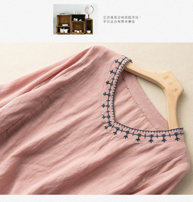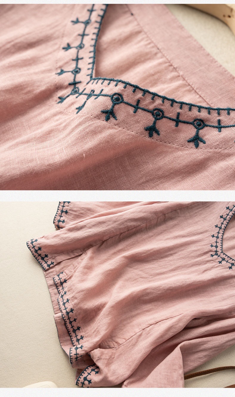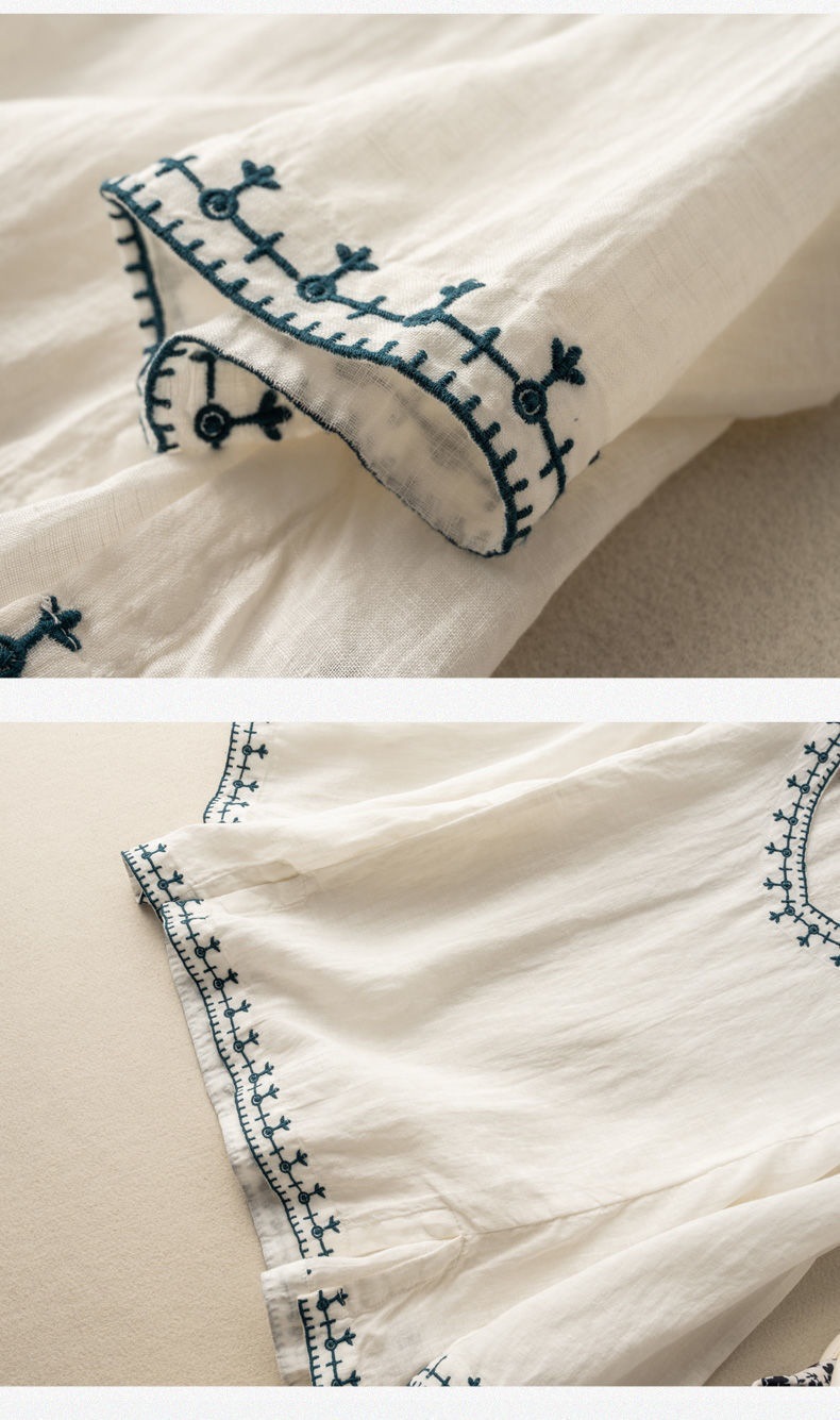 세븐부 소매 자수 면 및 린넨 탑, 예술적 복고풍 디자인, 여성용 얇은 셔츠, 루즈한 2024 봄 여름 새로운 트렌드