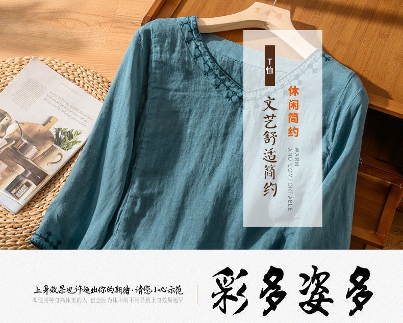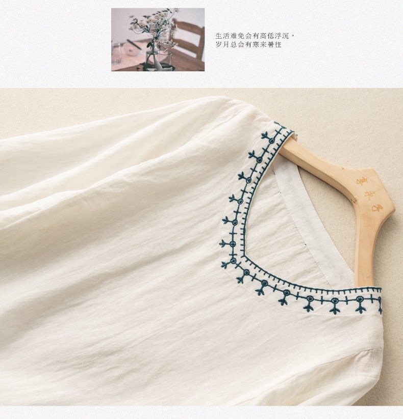 세븐부 소매 자수 면 및 린넨 탑, 예술적 복고풍 디자인, 여성용 얇은 셔츠, 루즈한 2024 봄 여름 새로운 트렌드스토어 가기