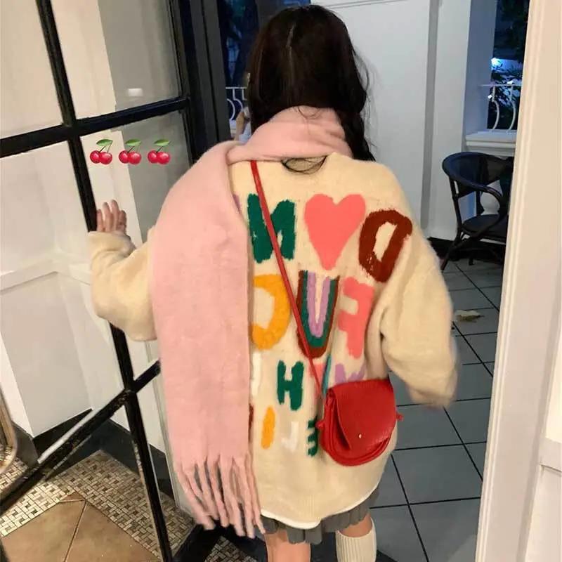 다채로운 편지 자카드 스웨터 여자의 작은 겨울 게으른 복고풍 일본 스타일 부드러운 느슨한 모든 일치 니트 탑스토어 가기