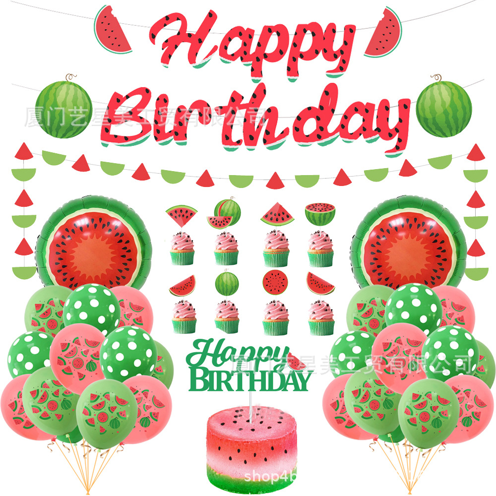 品名:西瓜主题生日派对 夏季西瓜拉旗 蛋糕插牌气球链装饰用品