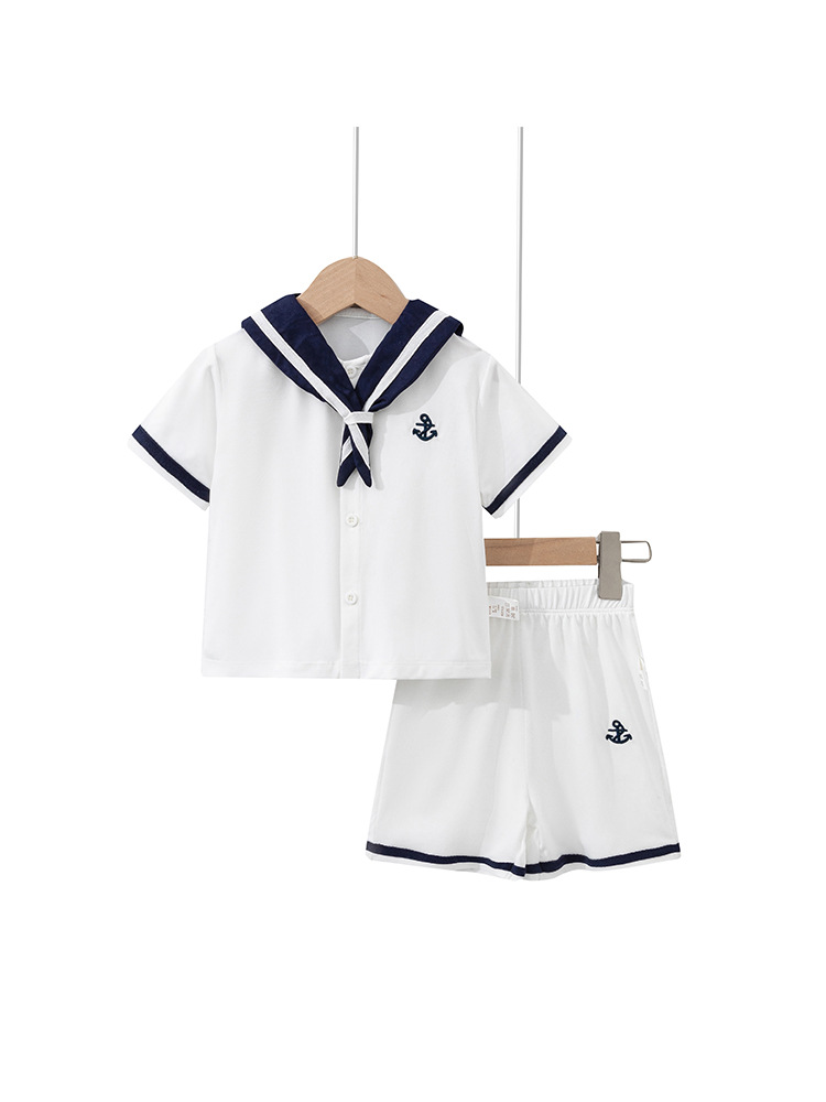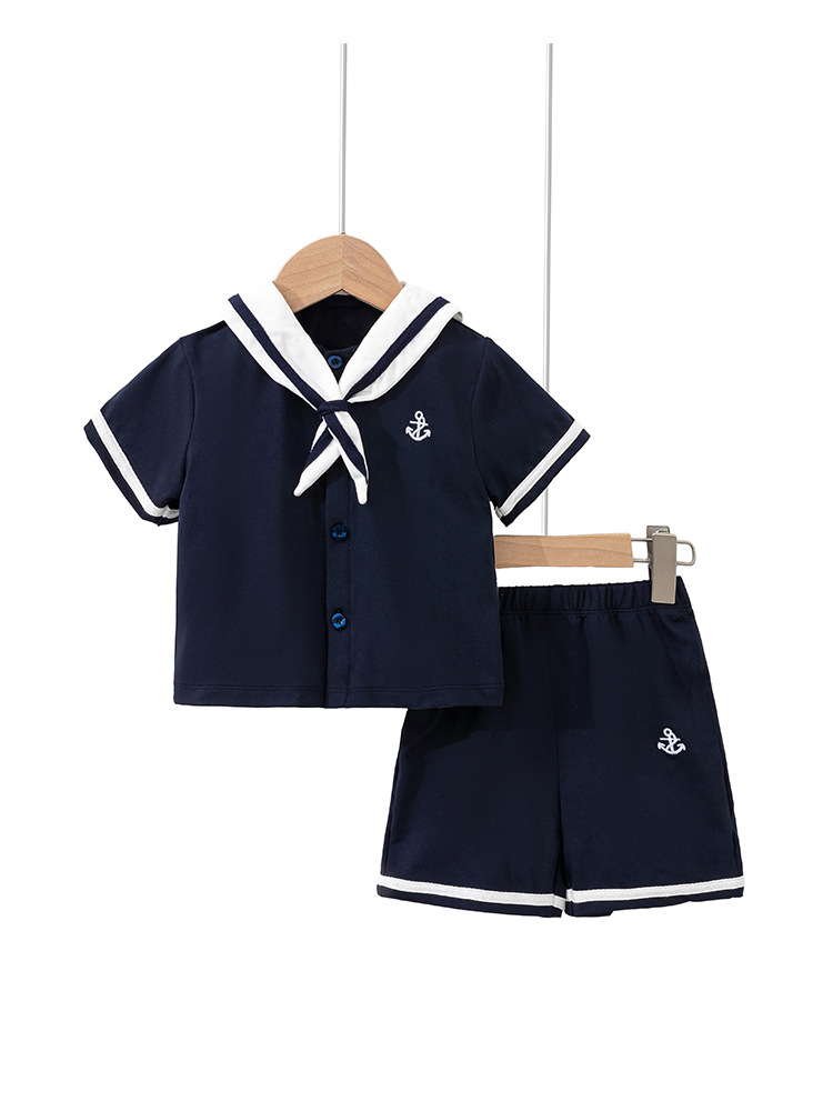 소년 작은 해군 반팔 투피스 세트 어린이 여름 얇은 베이비 대학 스타일 스플릿 선원 정장 세트 크로스 보더