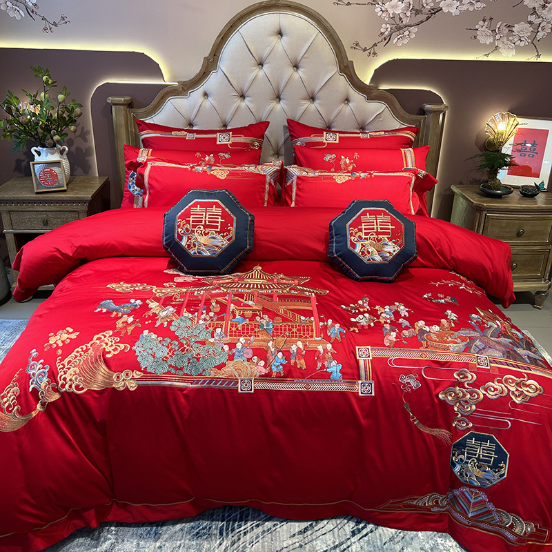 高端新品 采用最精细的樱花刺绣,风格也延续了当下最流行的故宫风,通过 庭院、花草、囍绣、与百子的结合,表达了家庭的祥和与幸福、寓意着开枝散叶,阖家安康…………誓好同心结,禧迎百子图 。。。