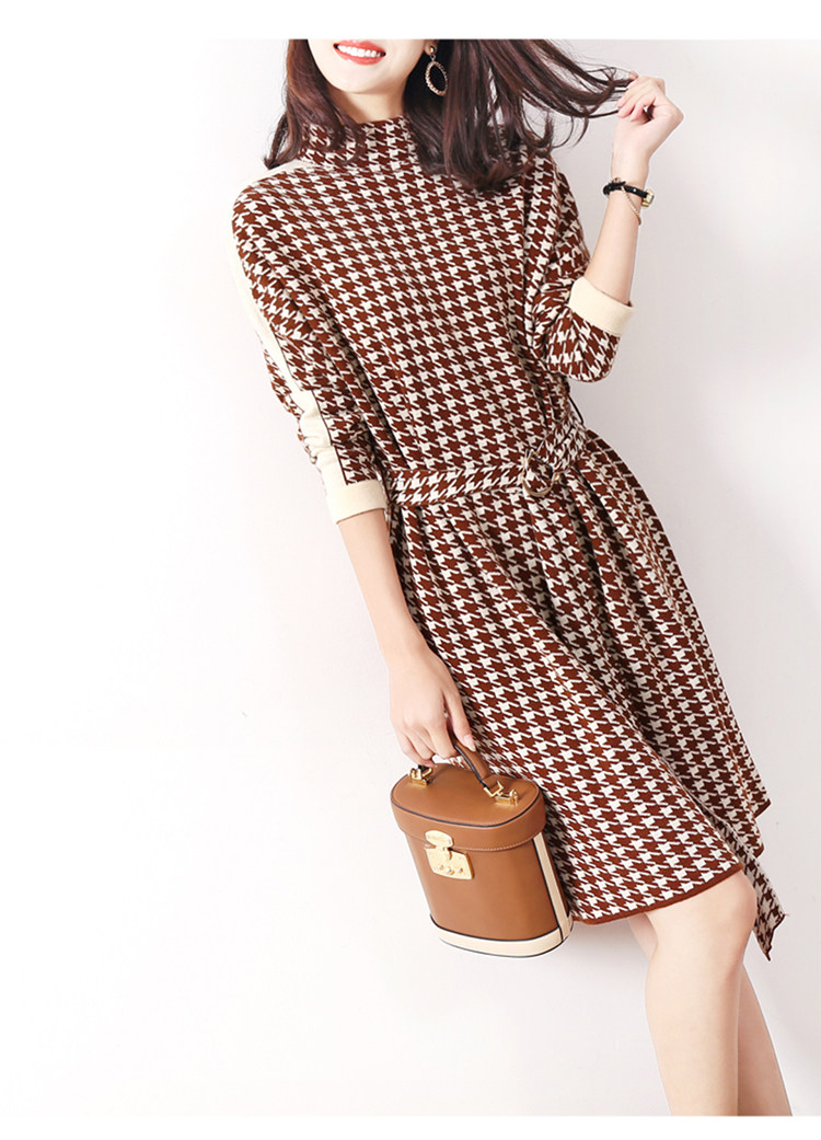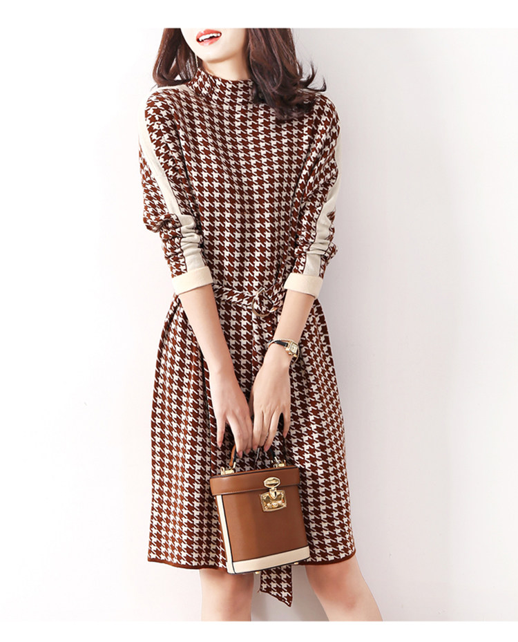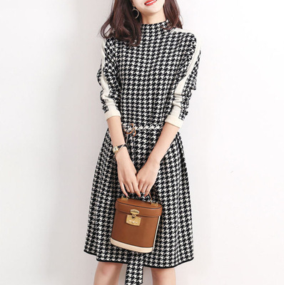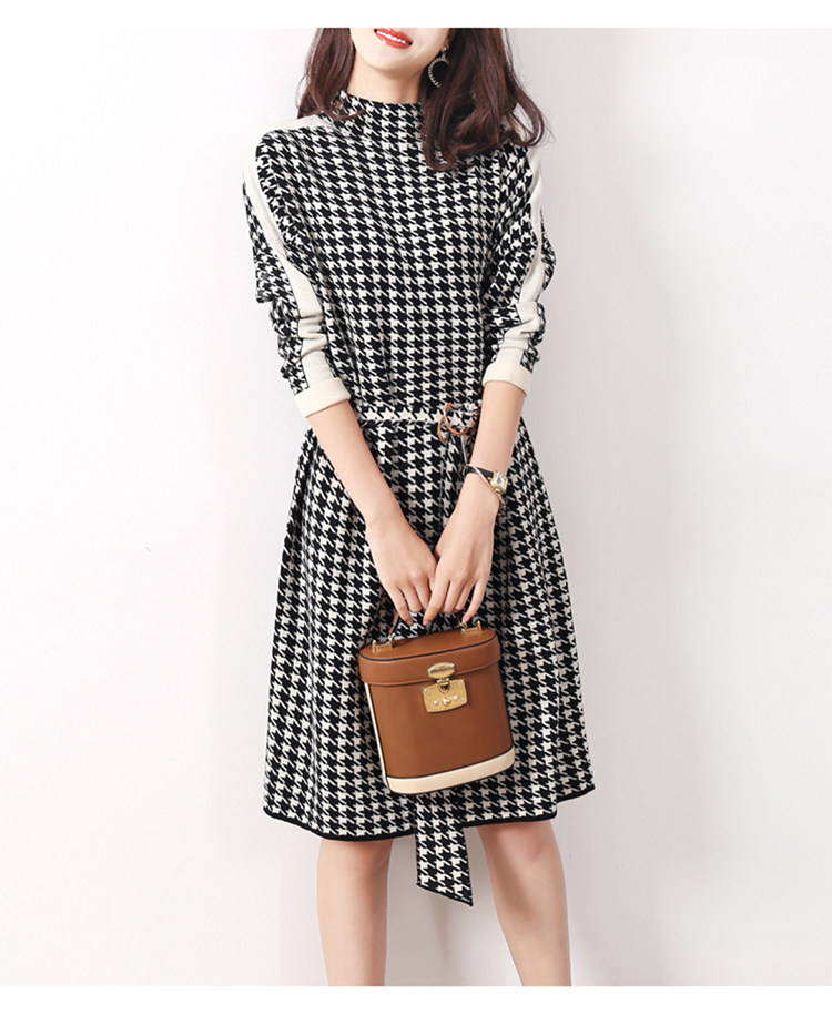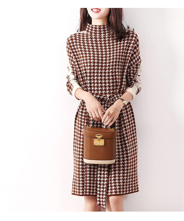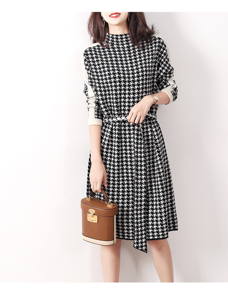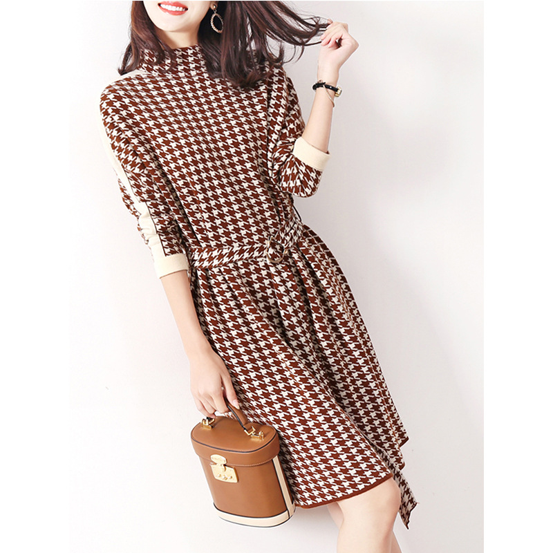 Houndstooth 니트 원피스 2022 새로운 패션 대비 색상 하프 하이 넥 레이스 A 라인 스커트 베이스 스웨터 스커트스토어 가기