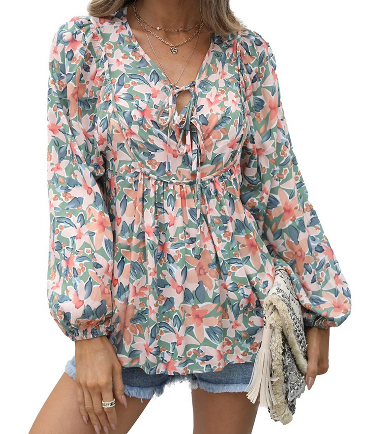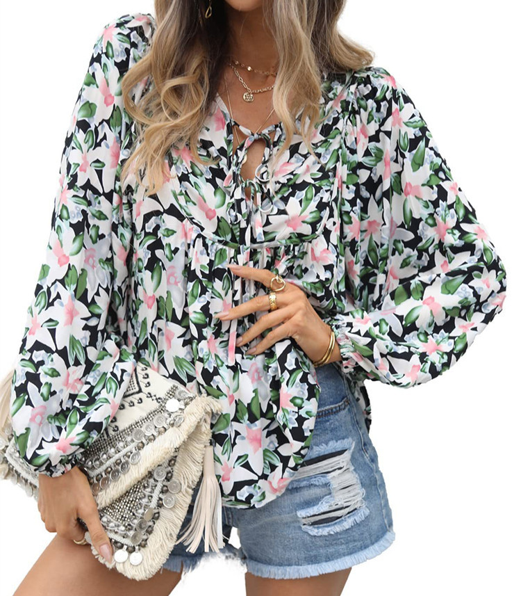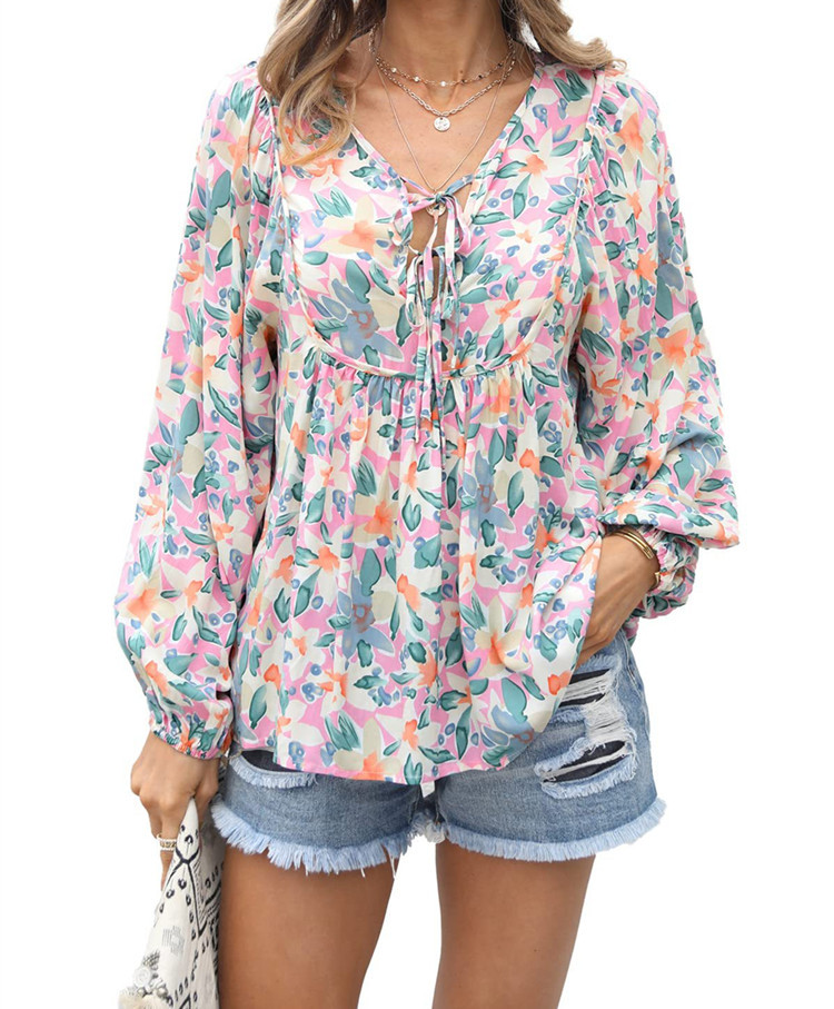 2022 아마존 새로운 여성 플로럴 프릴 거들 블라우스 레이스 업 V 넥 캐주얼 긴 소매 여성용 탑